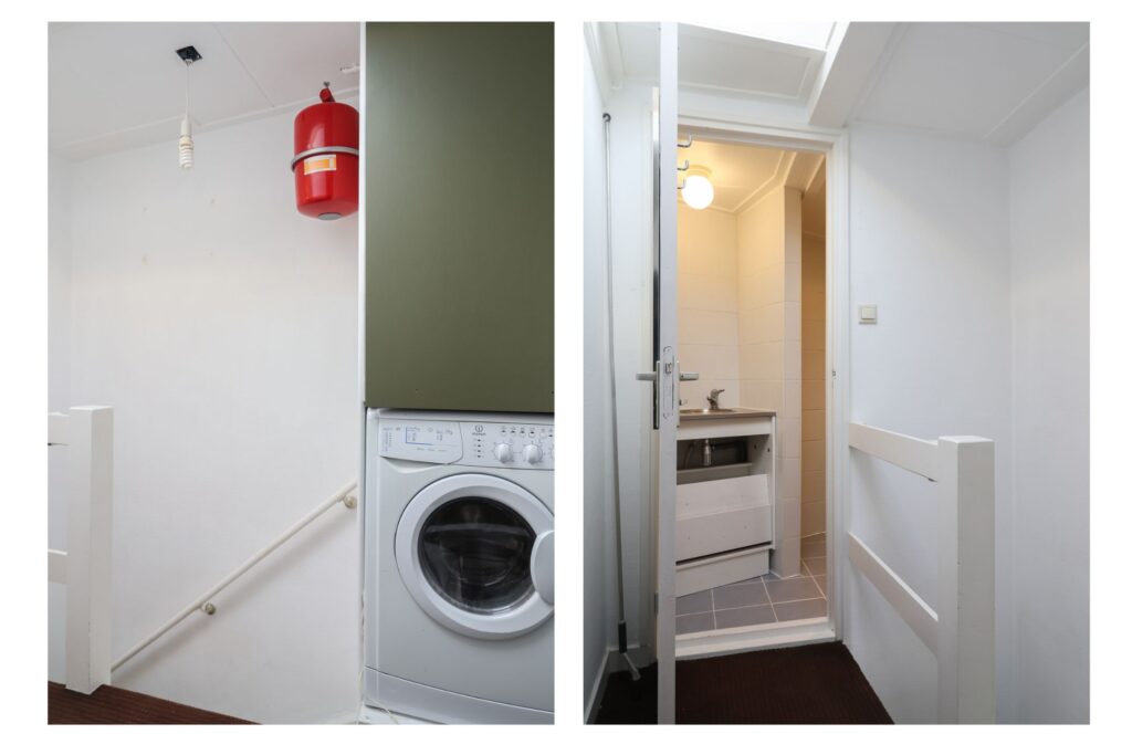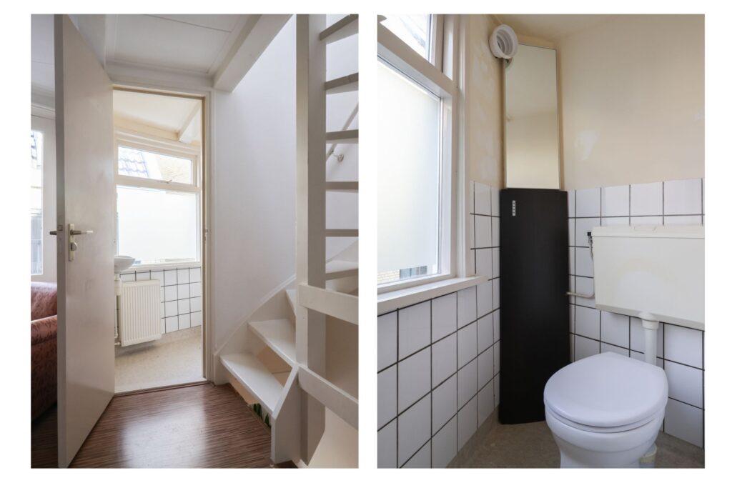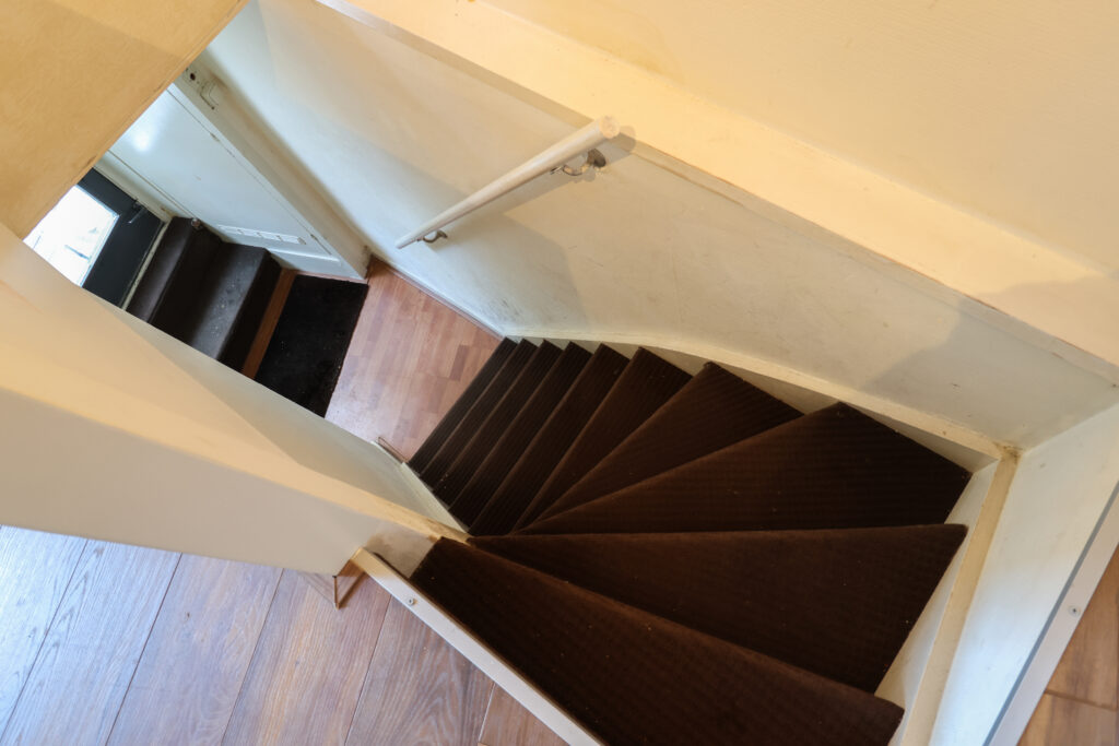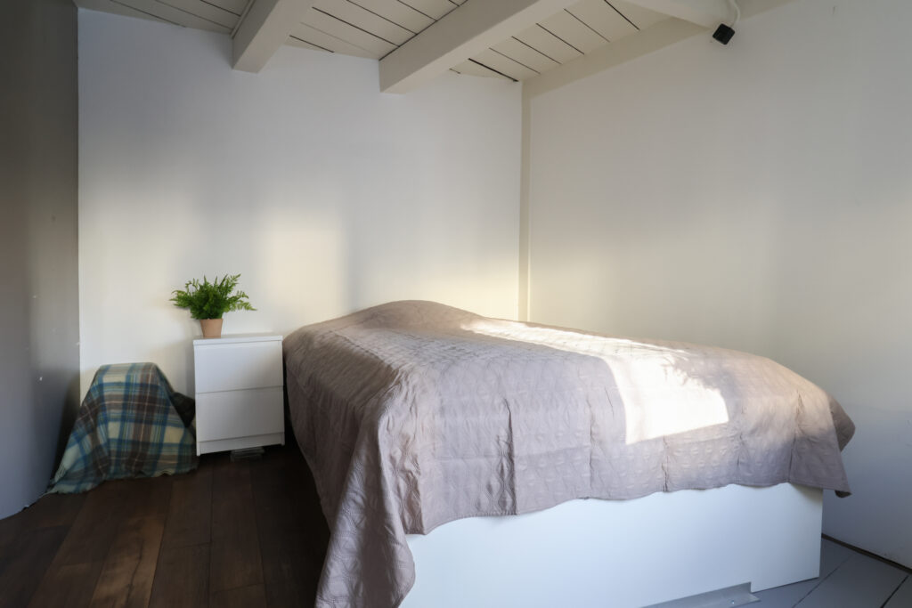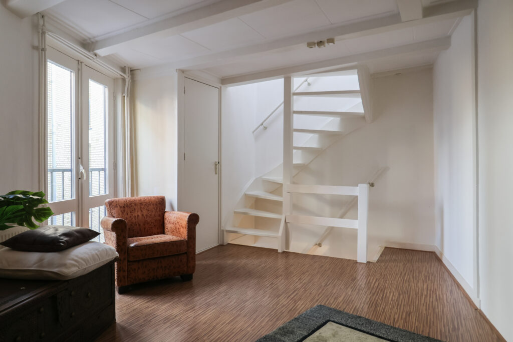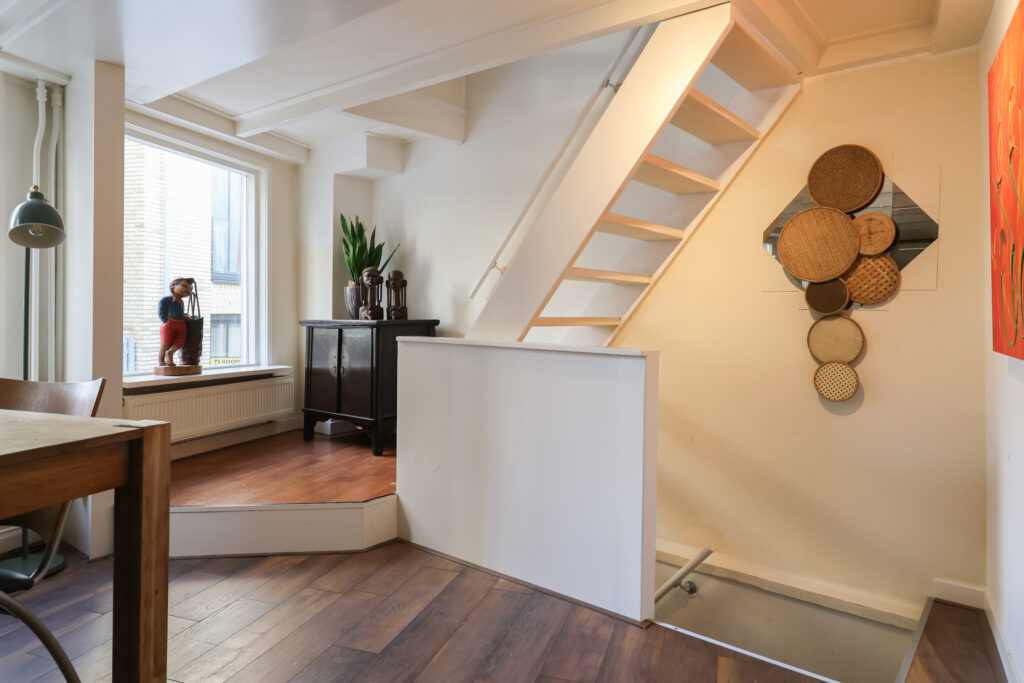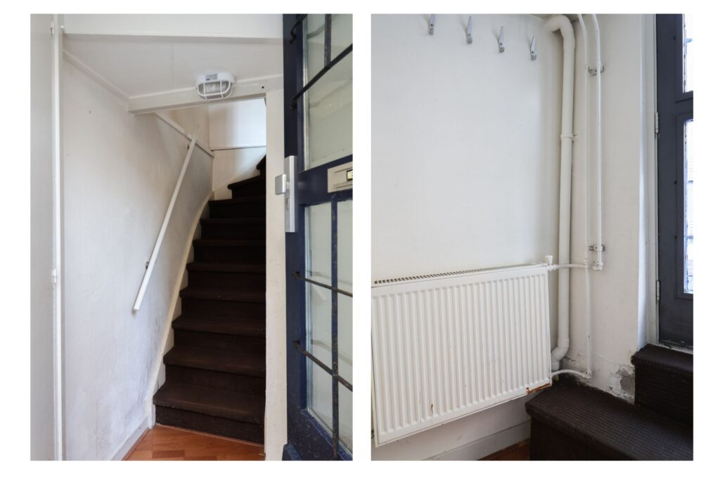 Eén daarvan is de lichte afschuining in de vloer op de bovenste verdieping. Dit is géén bouwfout, maar een typisch, functioneel element uit de tijd waarin het pand werd gebouwd, toen de verdieping werd gebruikt voor opslag en goederenverwerking. Tegenwoordig zorgt het vooral voor extra karakter en een bijzonder woongevoel.