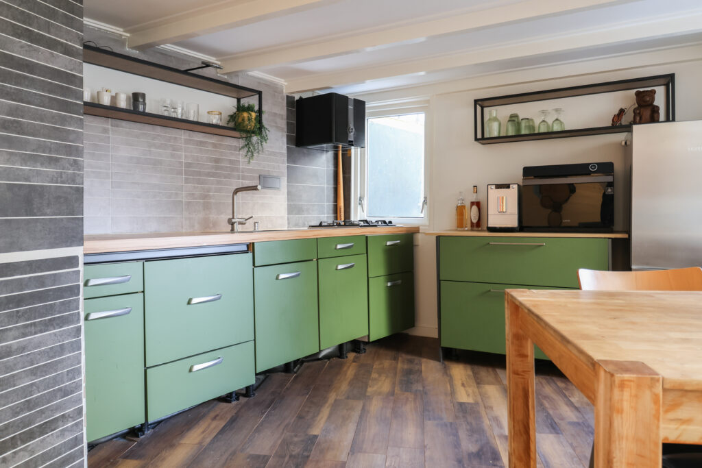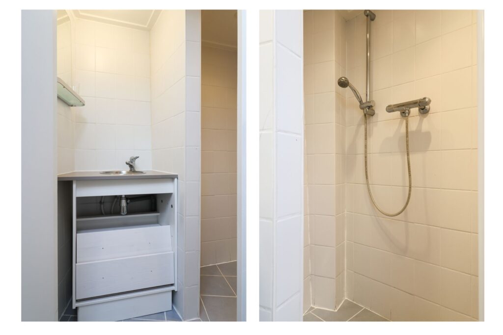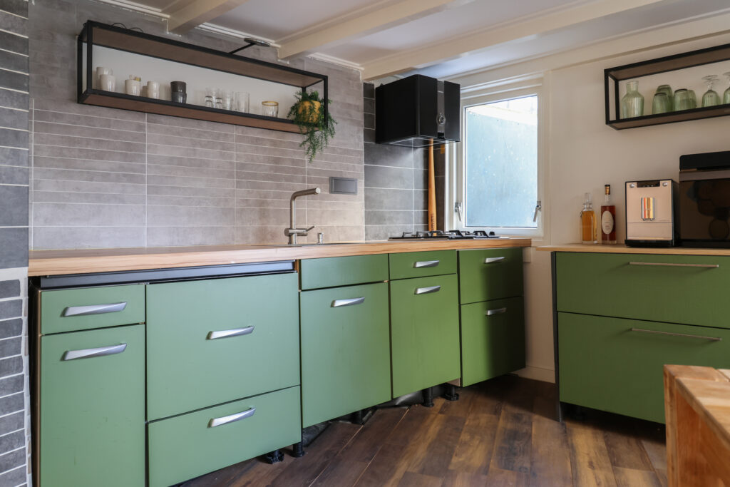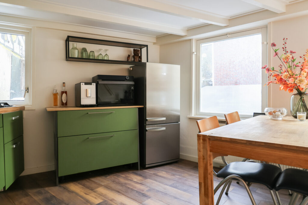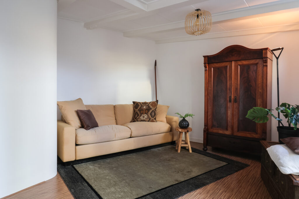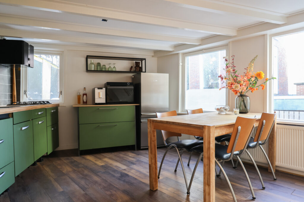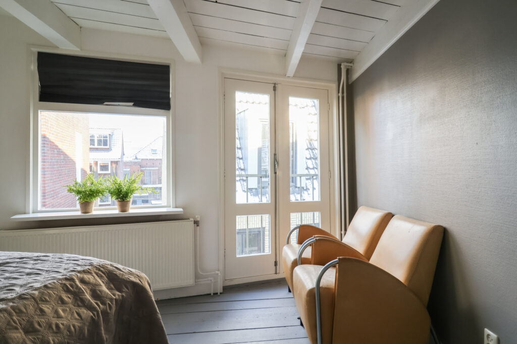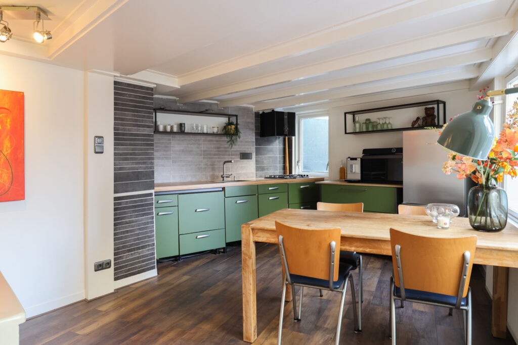 Eén daarvan is de lichte afschuining in de vloer op de bovenste verdieping. Dit is géén bouwfout, maar een typisch, functioneel element uit de tijd waarin het pand werd gebouwd, toen de verdieping werd gebruikt voor opslag en goederenverwerking. Tegenwoordig zorgt het vooral voor extra karakter en een bijzonder woongevoel.
