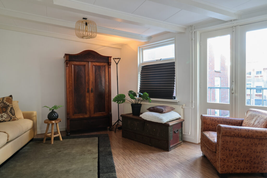 2e woonlaag: Knusse woonkamer met Frans balkon, toegang tot toilet en trap naar verdieping