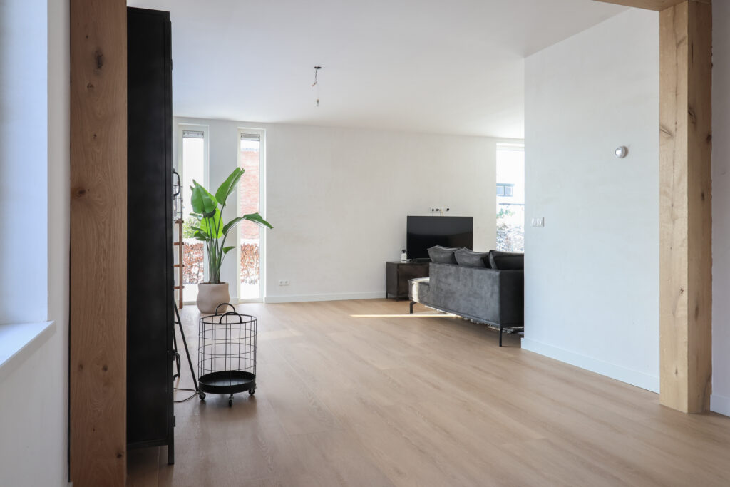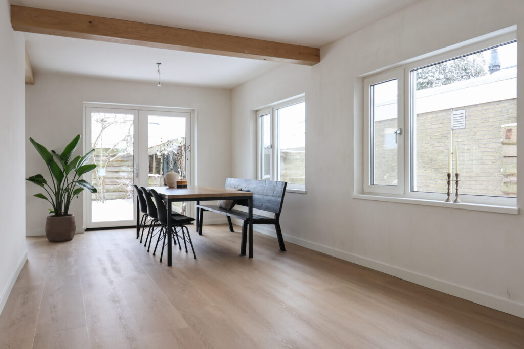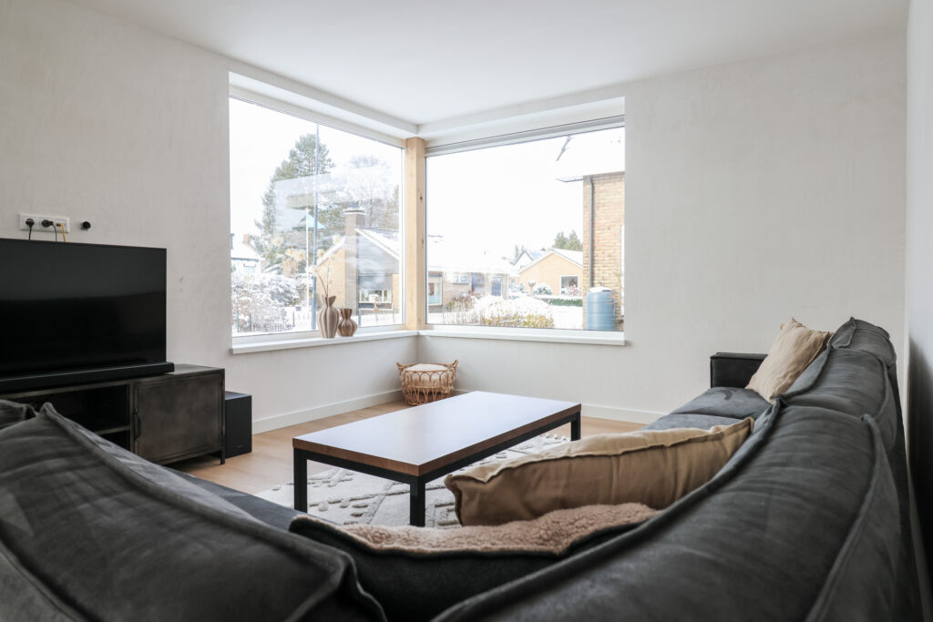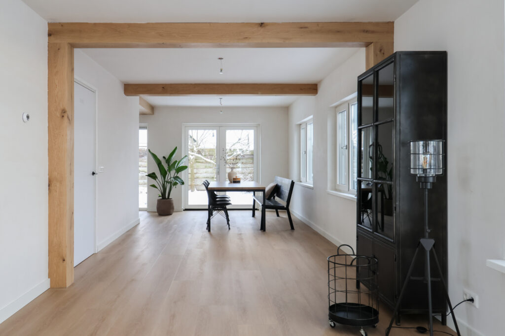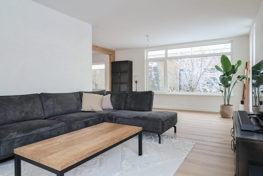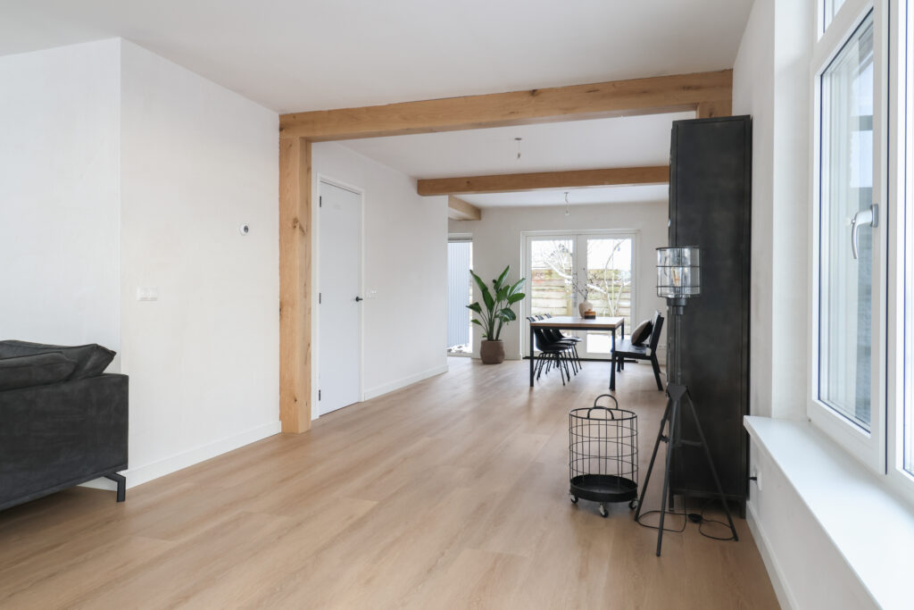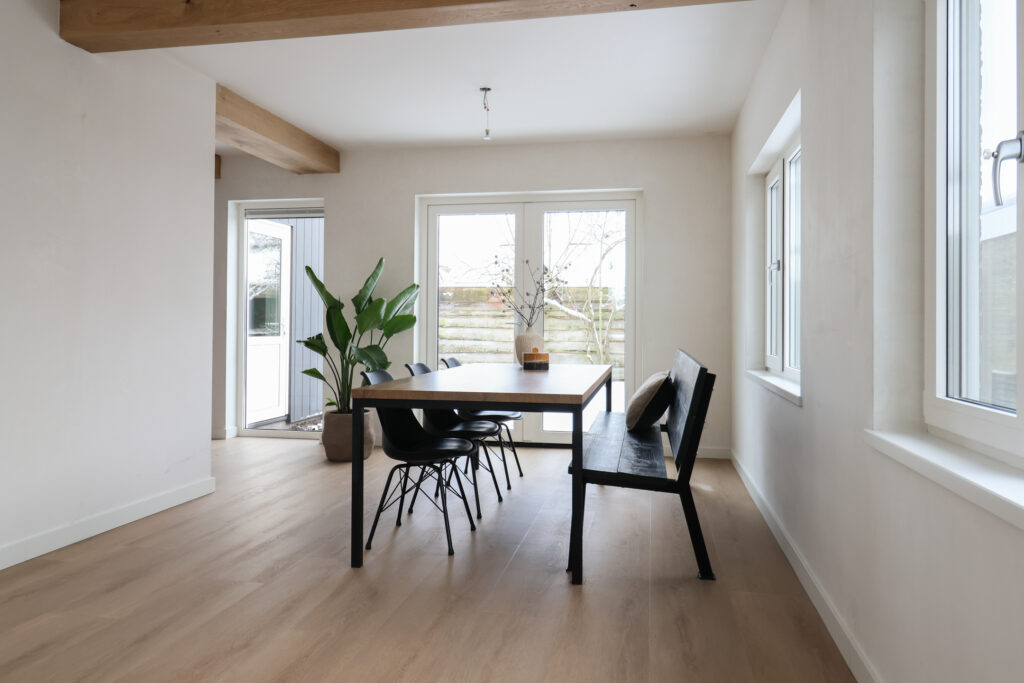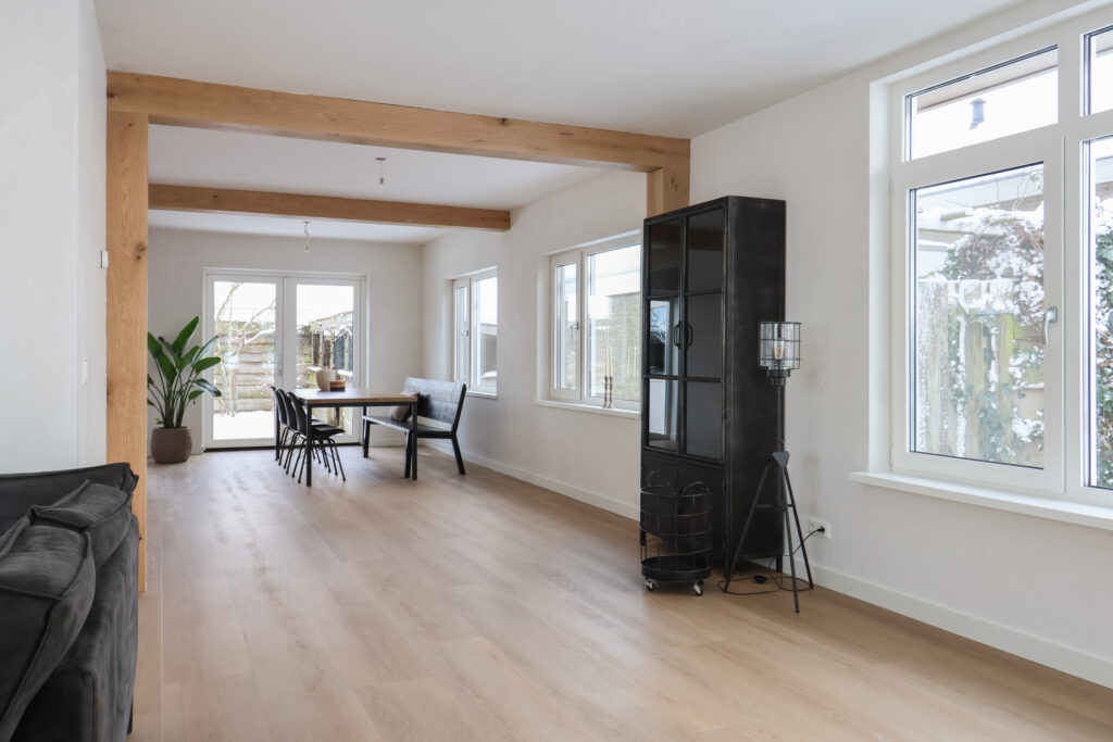 Het woongedeelte is recent opnieuw ingedeeld en dat merk je direct: een heerlijke, open leefruimte met veel ramen, prachtig zicht en volop lichtinval. Woonkamer, eetkamer en keuken lopen vloeiend in elkaar over. Aan de achterzijde zorgen openslaande tuindeuren voor een fijne verbinding met de tuin. De moderne keuken in hoekopstelling maakt het geheel compleet.
