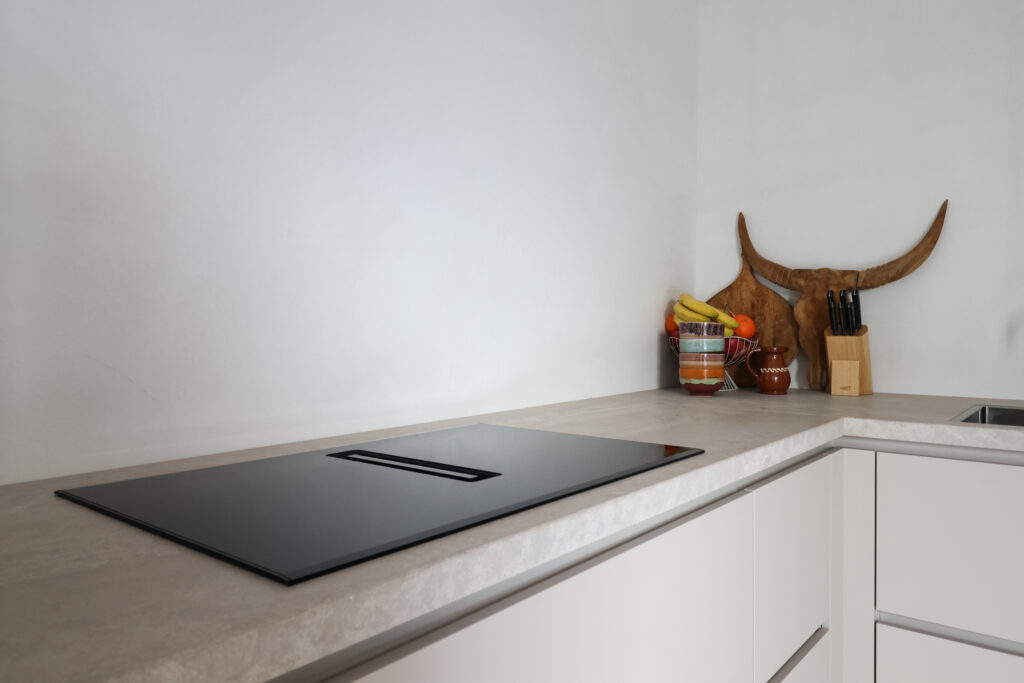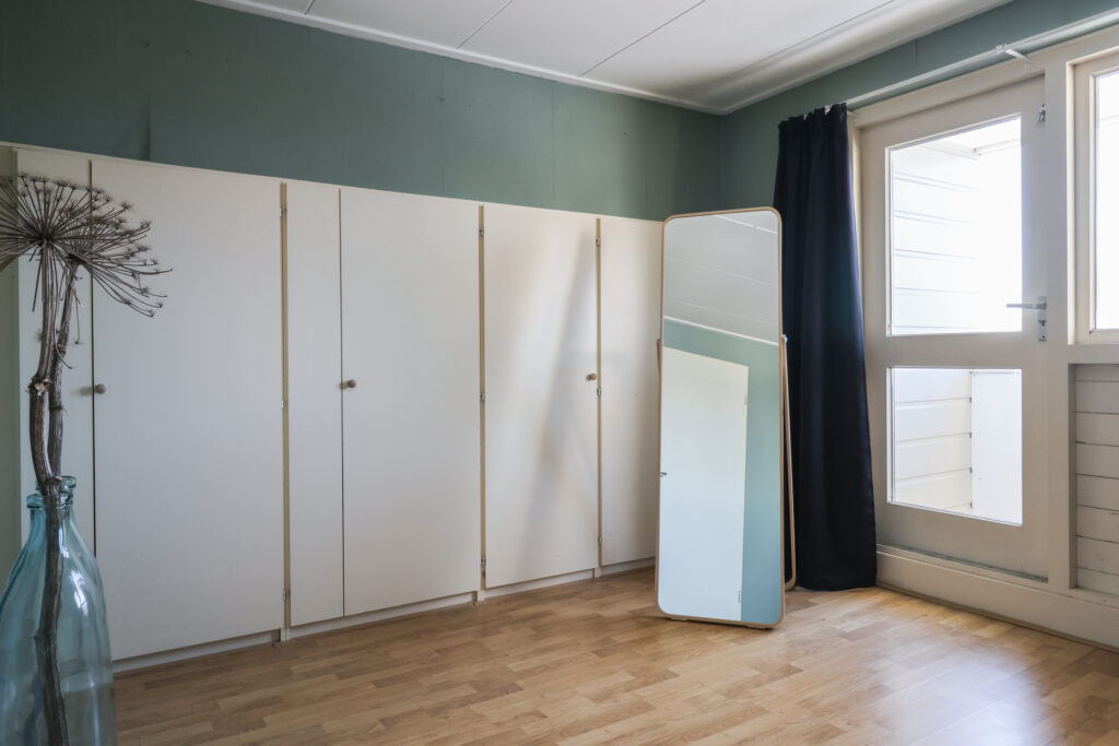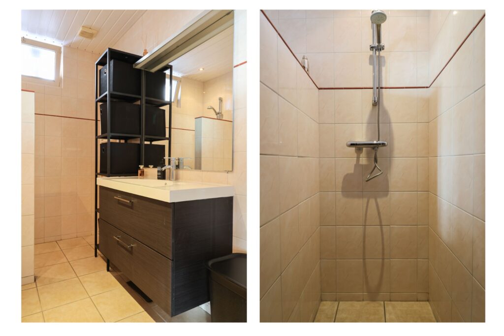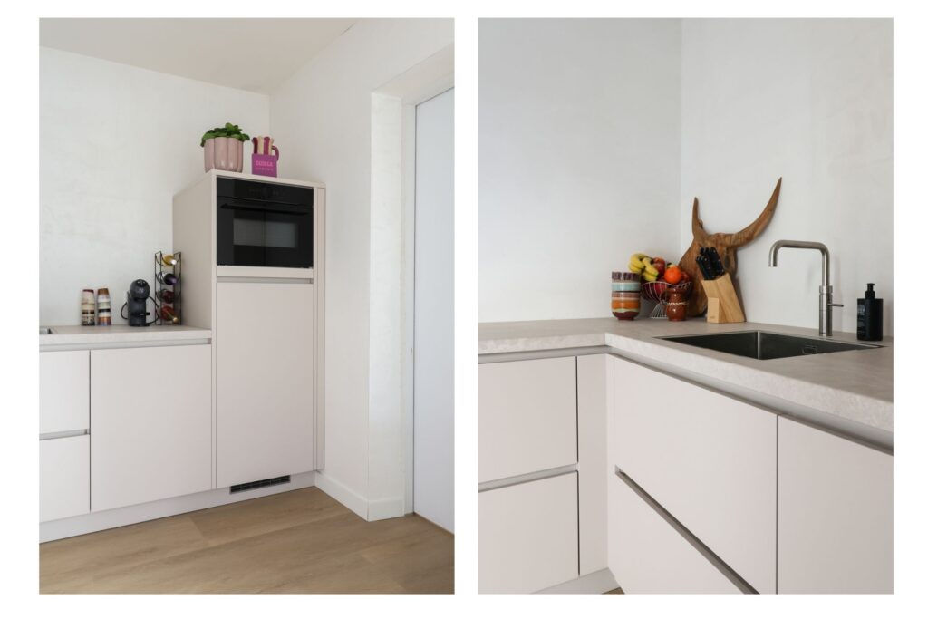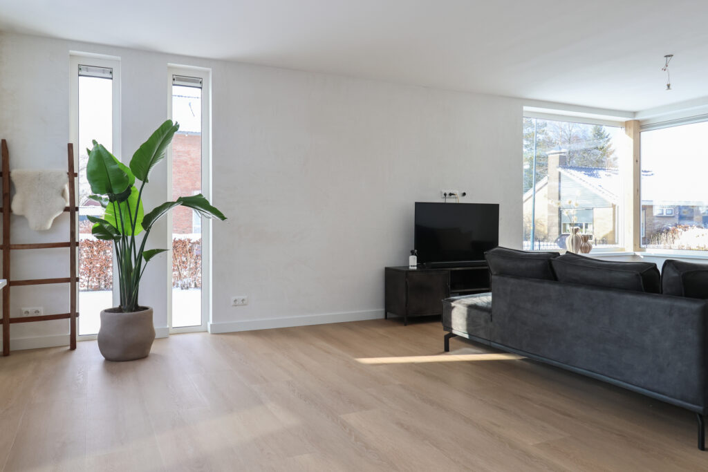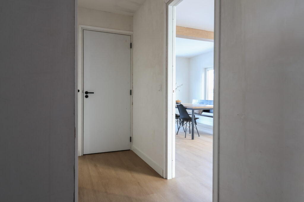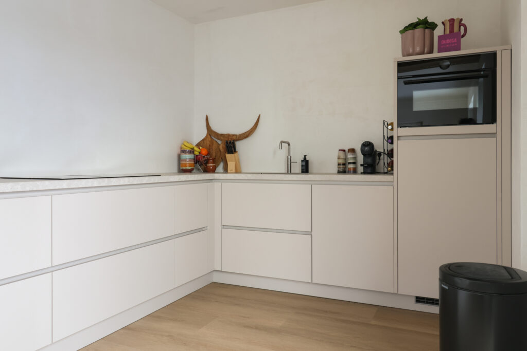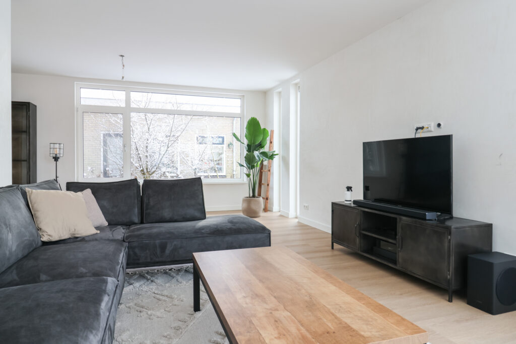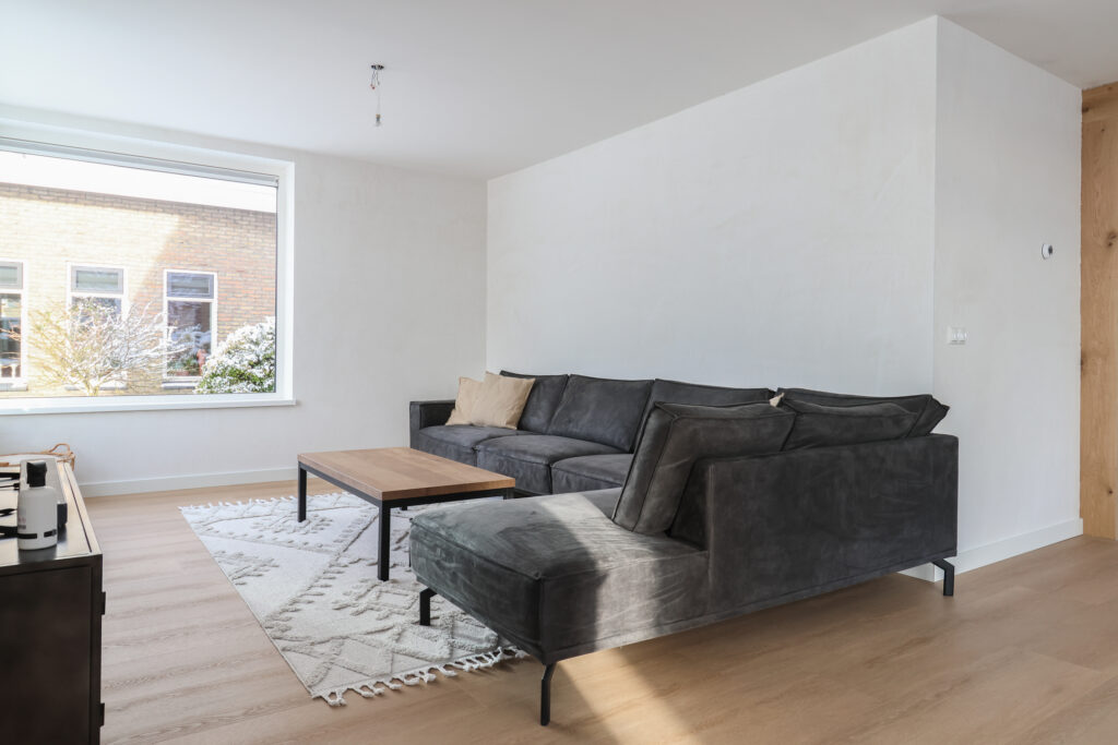 Het woongedeelte is recent opnieuw ingedeeld en dat merk je direct: een heerlijke, open leefruimte met veel ramen, prachtig zicht en volop lichtinval. Woonkamer, eetkamer en keuken lopen vloeiend in elkaar over. Aan de achterzijde zorgen openslaande tuindeuren voor een fijne verbinding met de tuin. De moderne keuken in hoekopstelling maakt het geheel compleet.