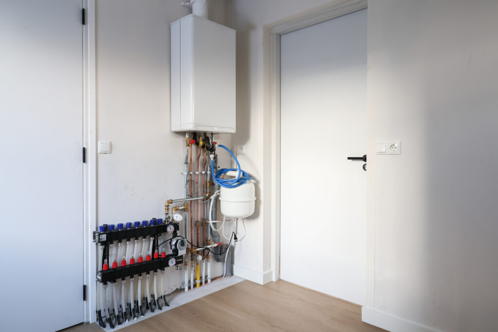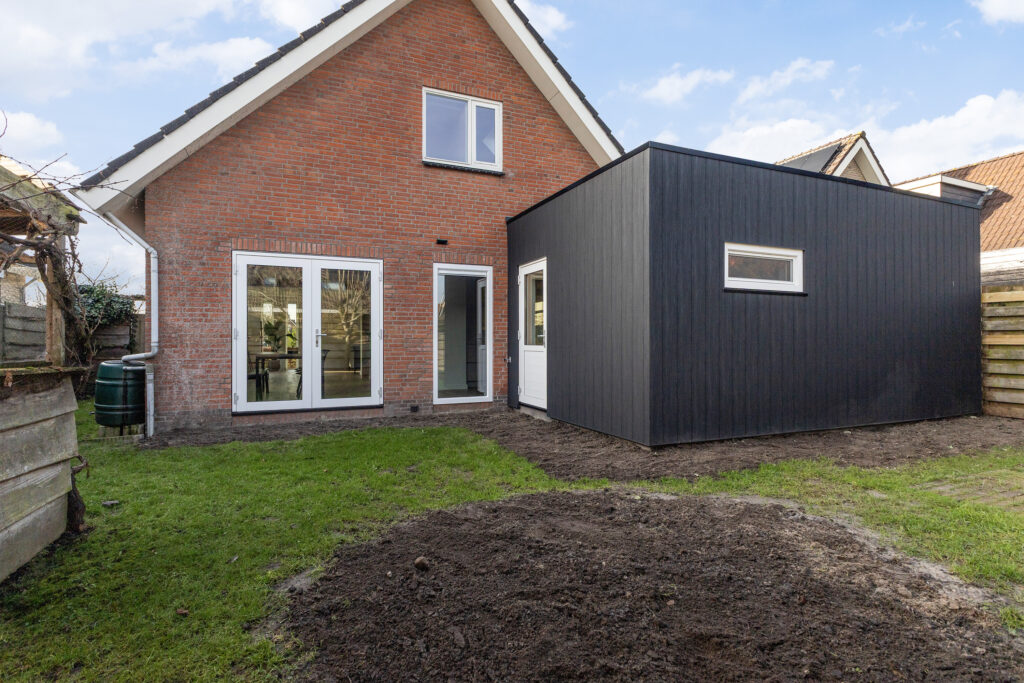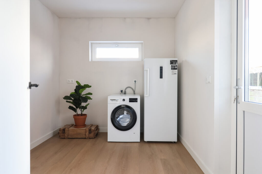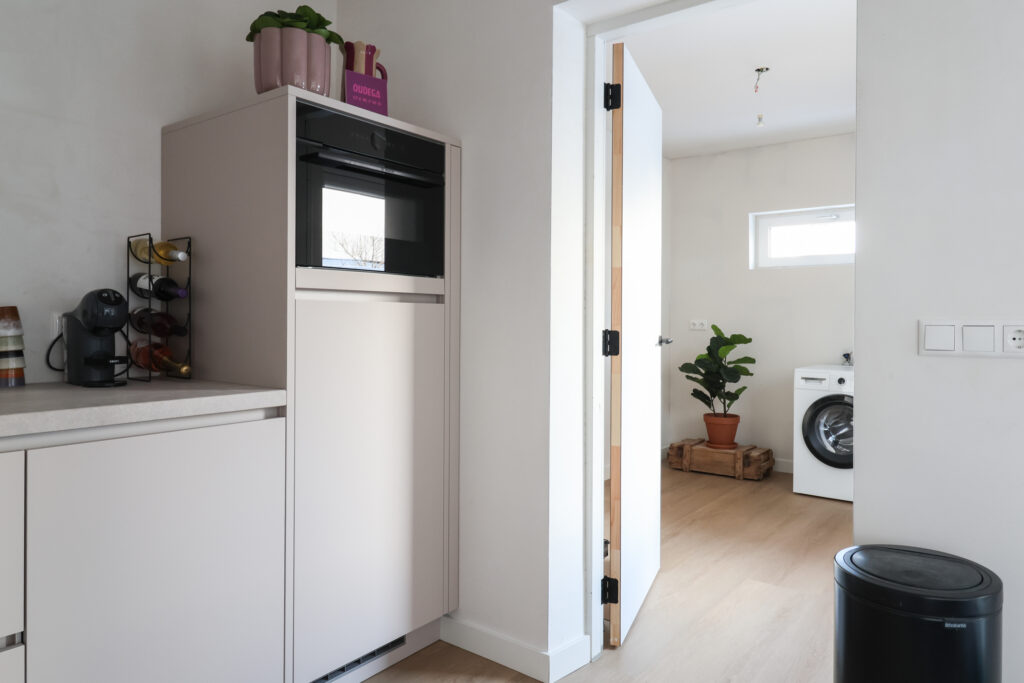 De recent aangebouwde bijkeuken biedt plaats aan de wasmachine- en cv-opstelling en geeft toegang tot zowel de aangebouwde garage als de tuin.