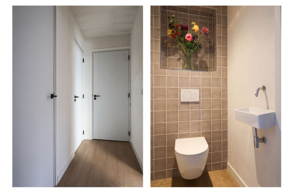 Begane grond: Via de zij-entree kom je in de hal met meterkast, praktische bergkast, trapopgang naar de eerste verdieping en een modern toilet met fonteintje. Vanuit de hal is tevens de badkamer bereikbaar, voorzien van een ligbad, wastafel en een inloopdouche.