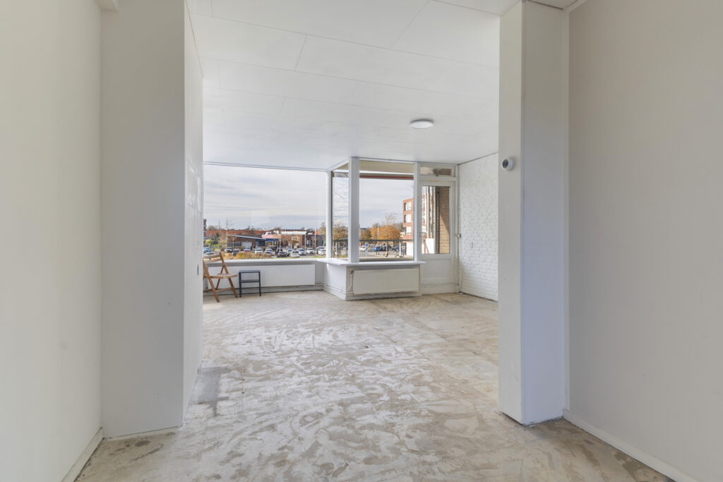 1e woonlaag: entree/hal met toilet en trap naar de 2e verdieping, dichte keuken (nog in te richten) en toegang tot de ruim opgezette woon-eetkamer met fraai zicht en deur naar het balkon.