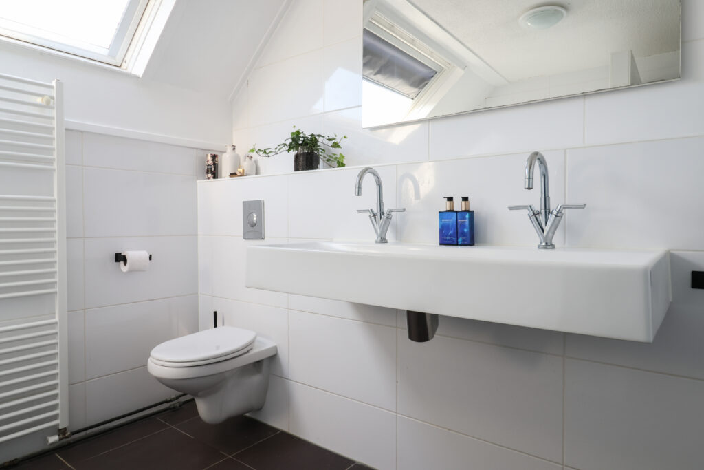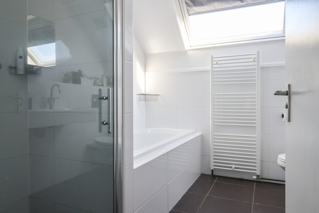 Overloop met toegang tot drie ruime slaapkamers en badkamer voorzien van ligbad, douchecabine, dubbele wastafel en toilet.