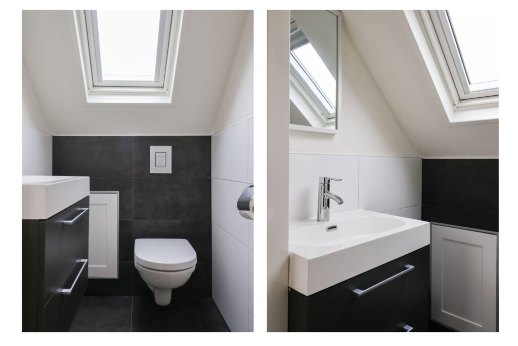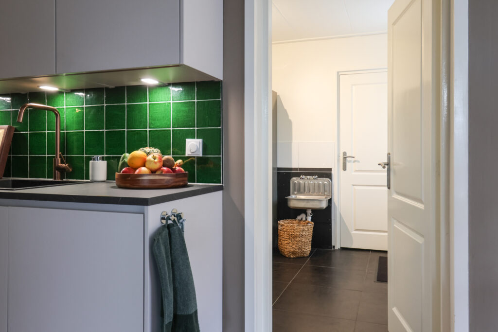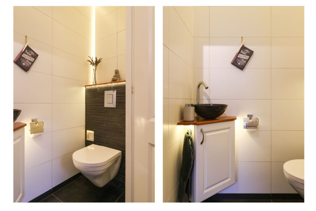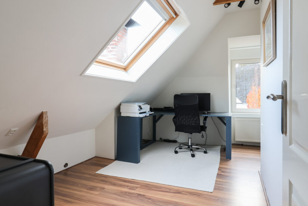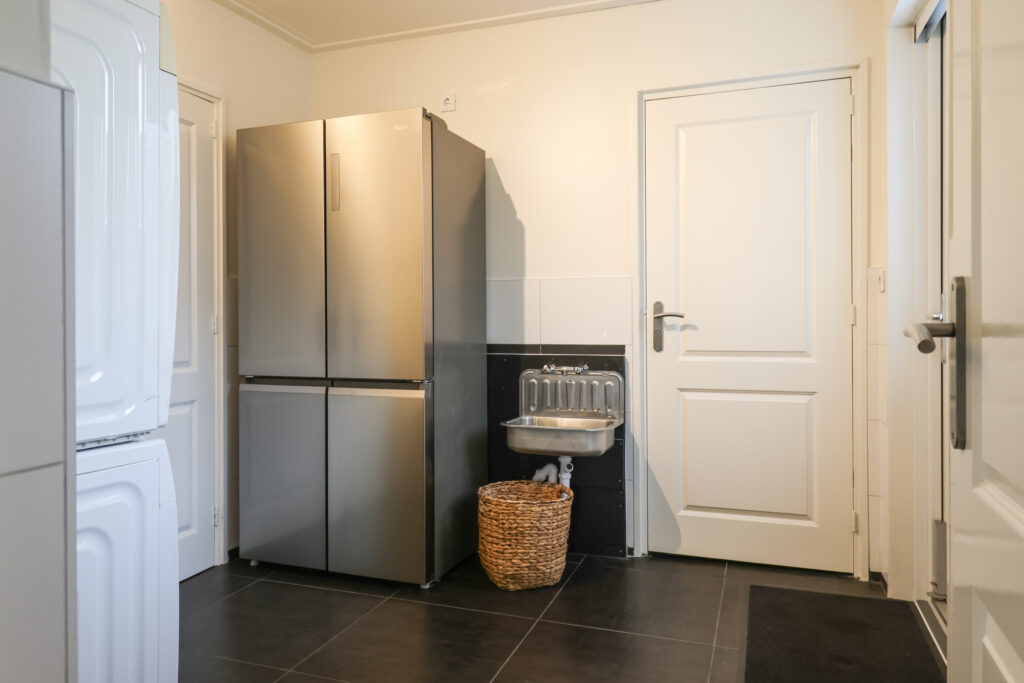 Vanuit de keuken is er toegang tot de bijkeuken met cv-opstelling en toilet. Aangrenzend vinden we de eigentijdse badkamer, uitgerust met een ligbad, douche en wastafel, waarachter zich nog een separate berging bevindt.
