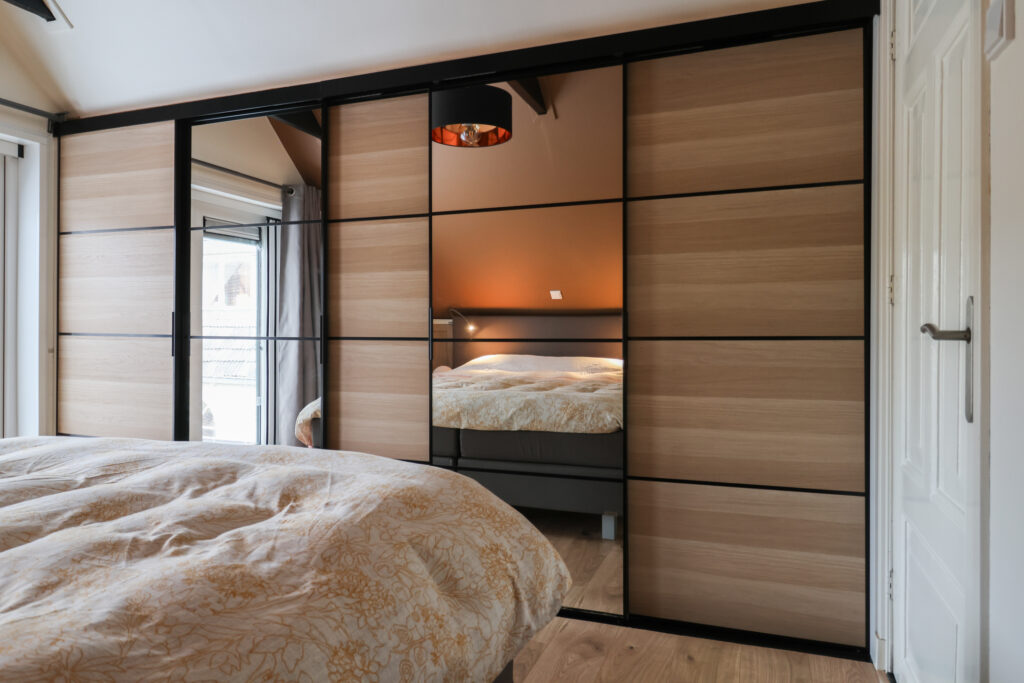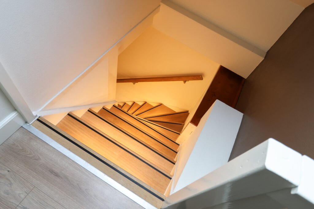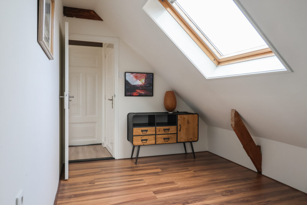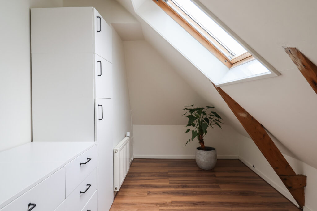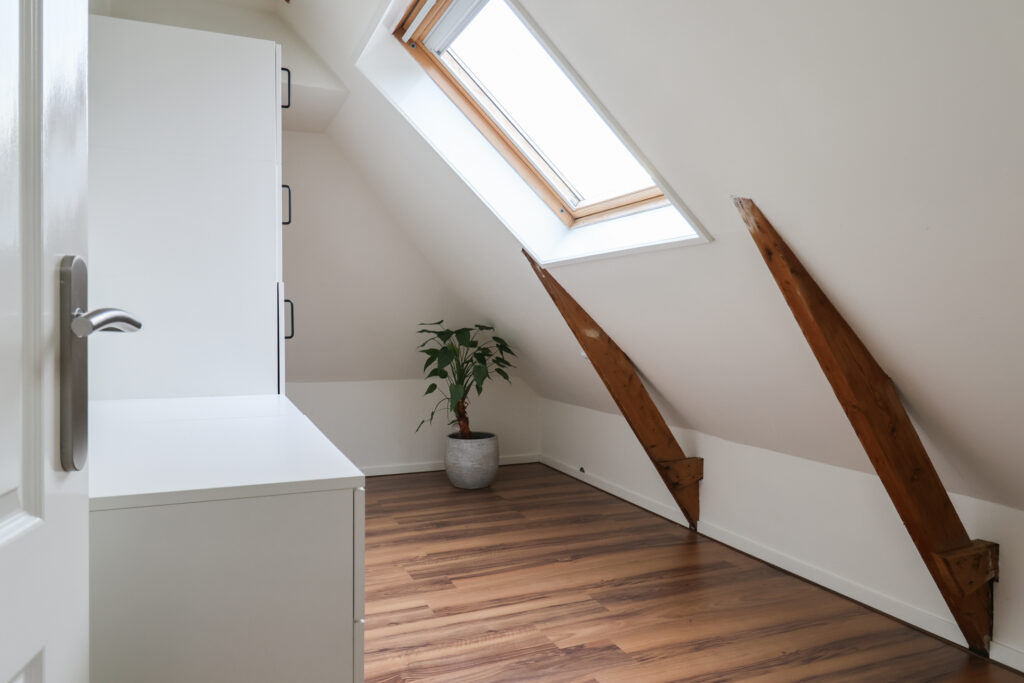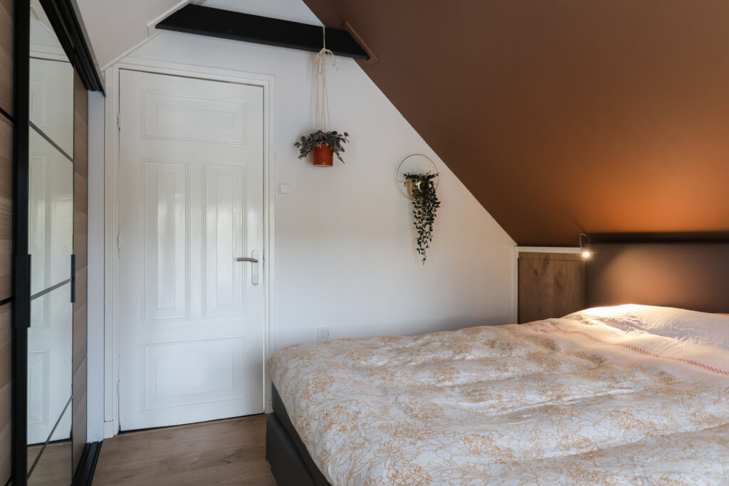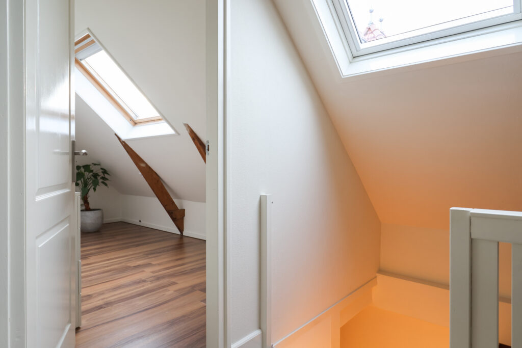 Overloop met separaat toilet en toegang tot drie lichte slaapkamers waarvan één met inbouwkast en toegang tot het platte dak.