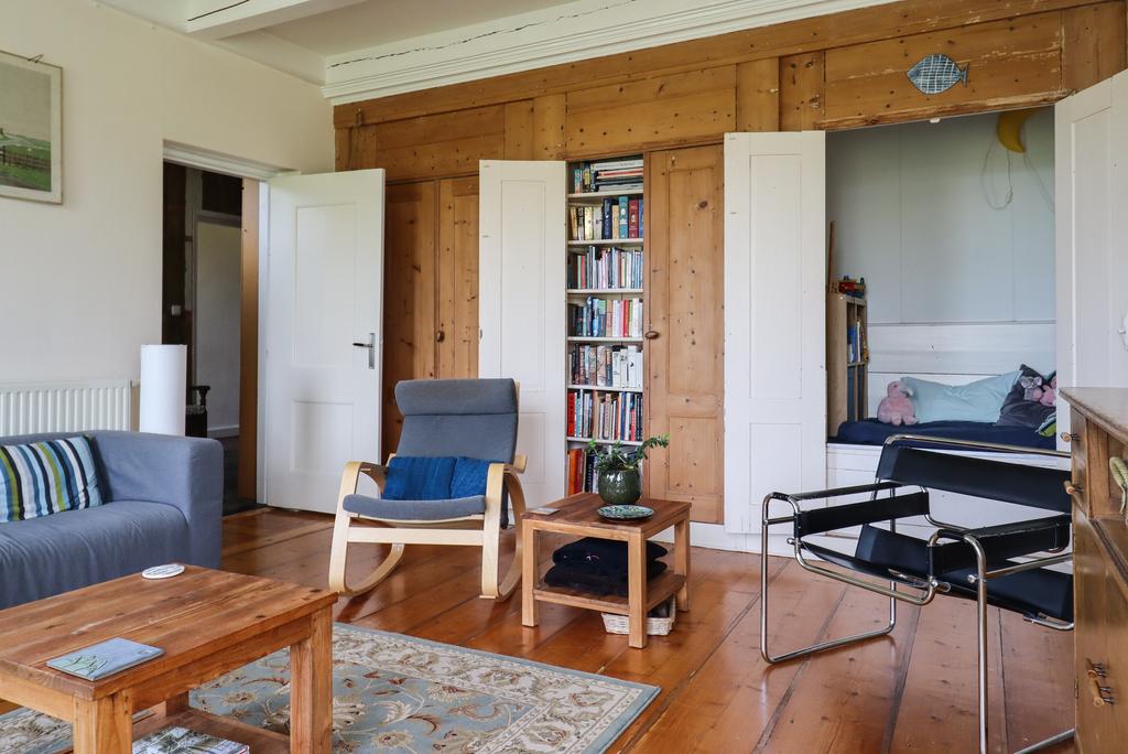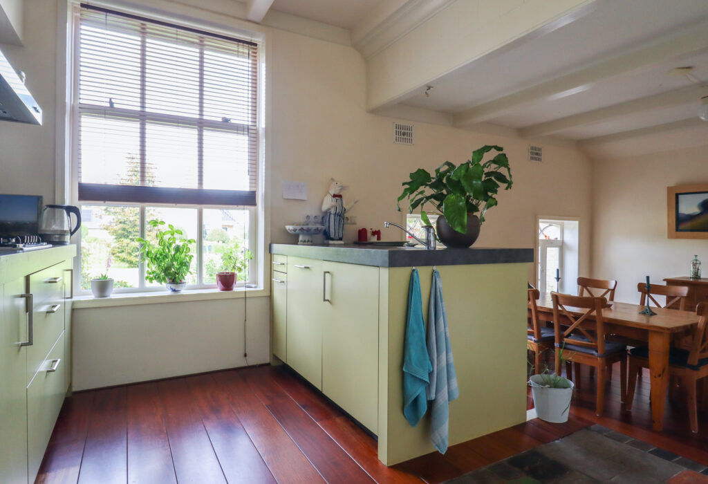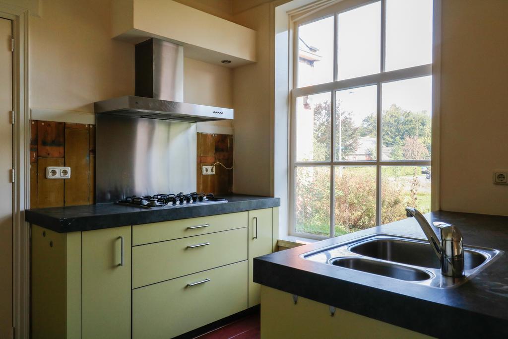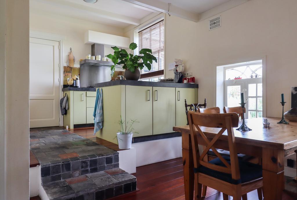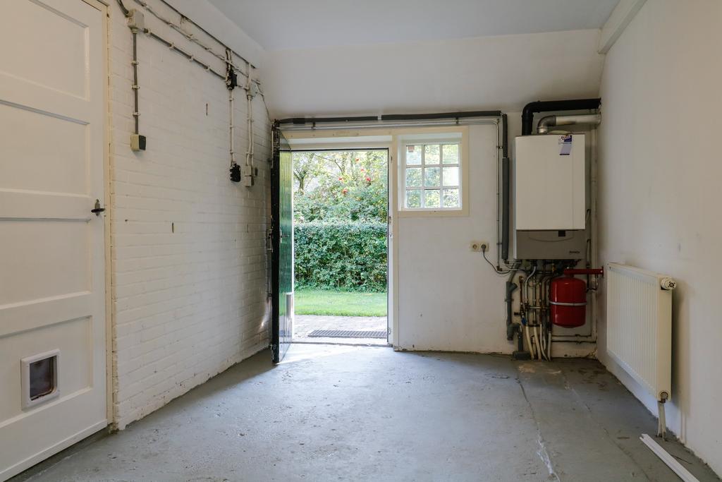 begane grond: entree/gang, voorraadkelder, woonkamer met geloogde bedstedewand, balkenplafond, lambrisering en originele plankenvloerdelen, de woonkeuken is voorzien van een modern keukenblok met o.a. vaatwasser, kookplaat e.d., parketvloeren met oude estriken, tussenhal met trap naar verdieping, toilet, moderne badkamer met douchehoek en v.w.t., ruime bijkeuken met Cv-ketel, wasmachine-aansluiting en zij-entree. Voorts is aan de oostzijde een stook-hut (berging) en terras/tuin.