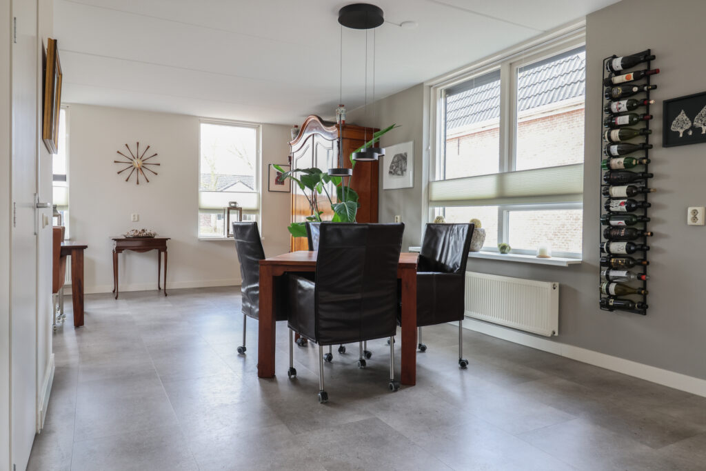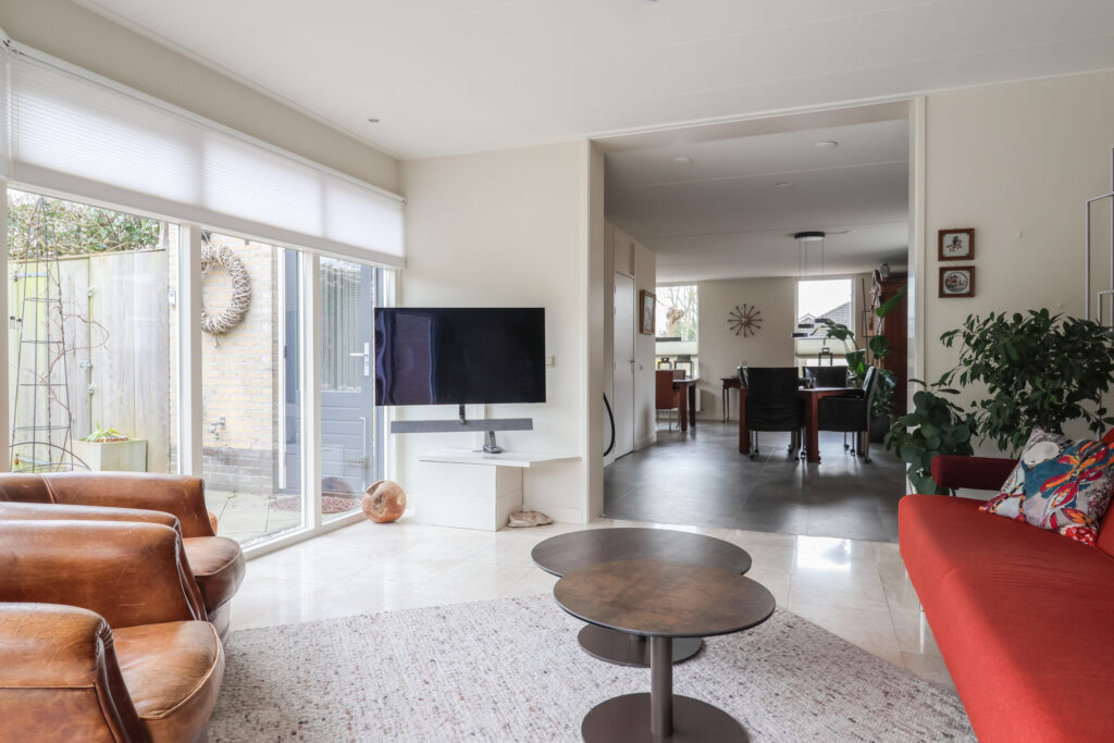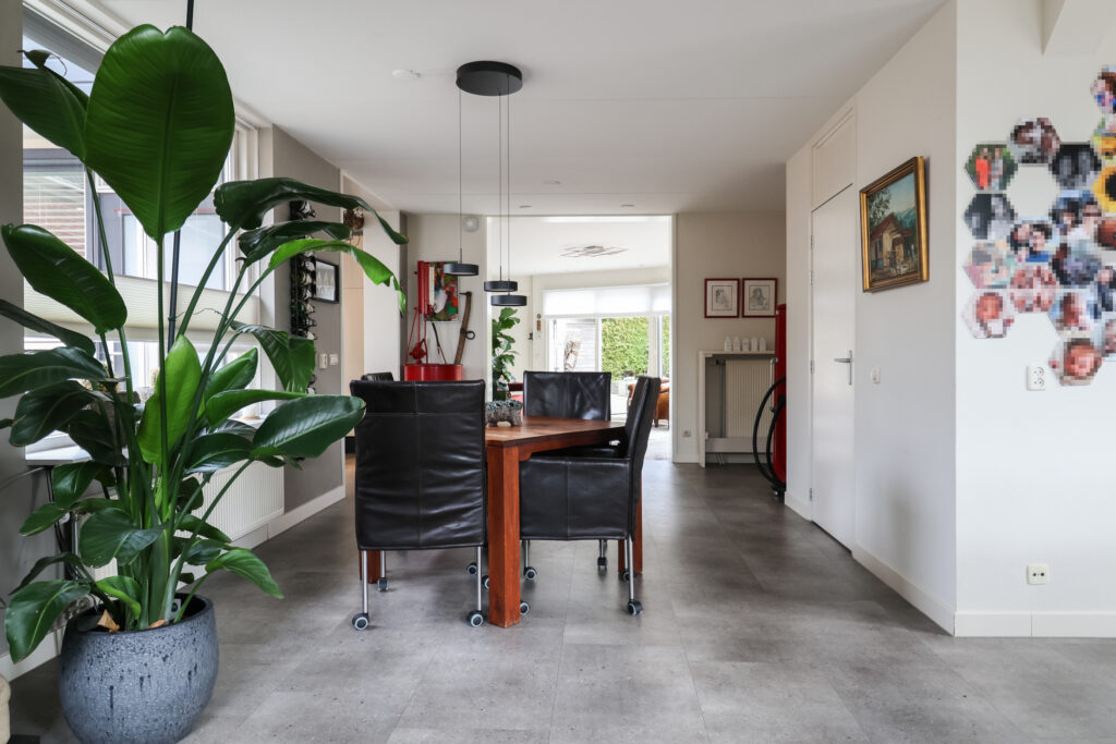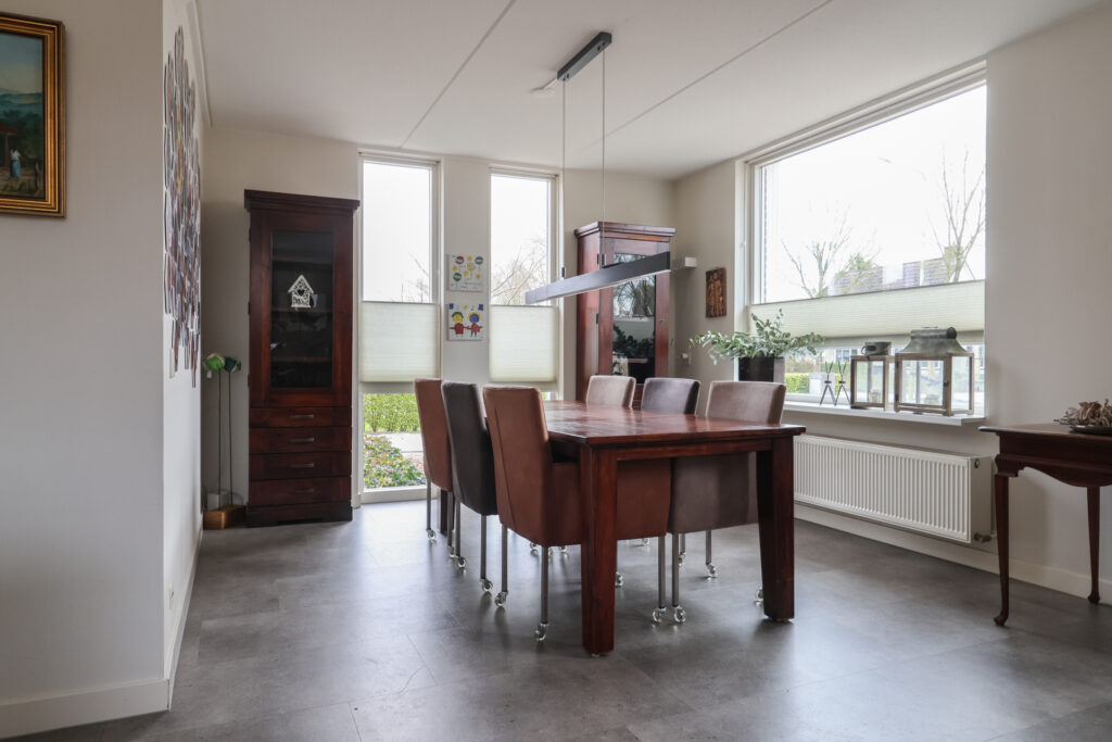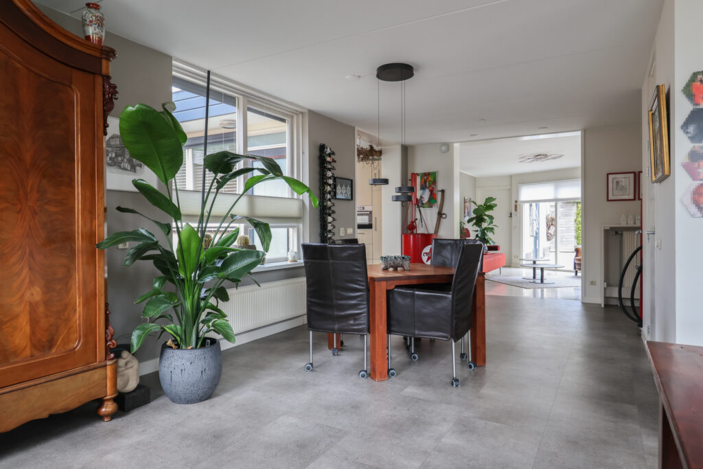 Via de zij-entree komt u in de hal met meterkast, trap naar de eerste verdieping en een toilet met fonteintje. Vanuit de hal bereikt u de L-vormige woon-/eetkamer, die een ruime en lichte leefruimte biedt. Aansluitend bevindt zich de halfopen, royaal opgezette keuken in de aanbouw, voorzien van diverse inbouwapparatuur en met tevens toegang tot de voortuin.