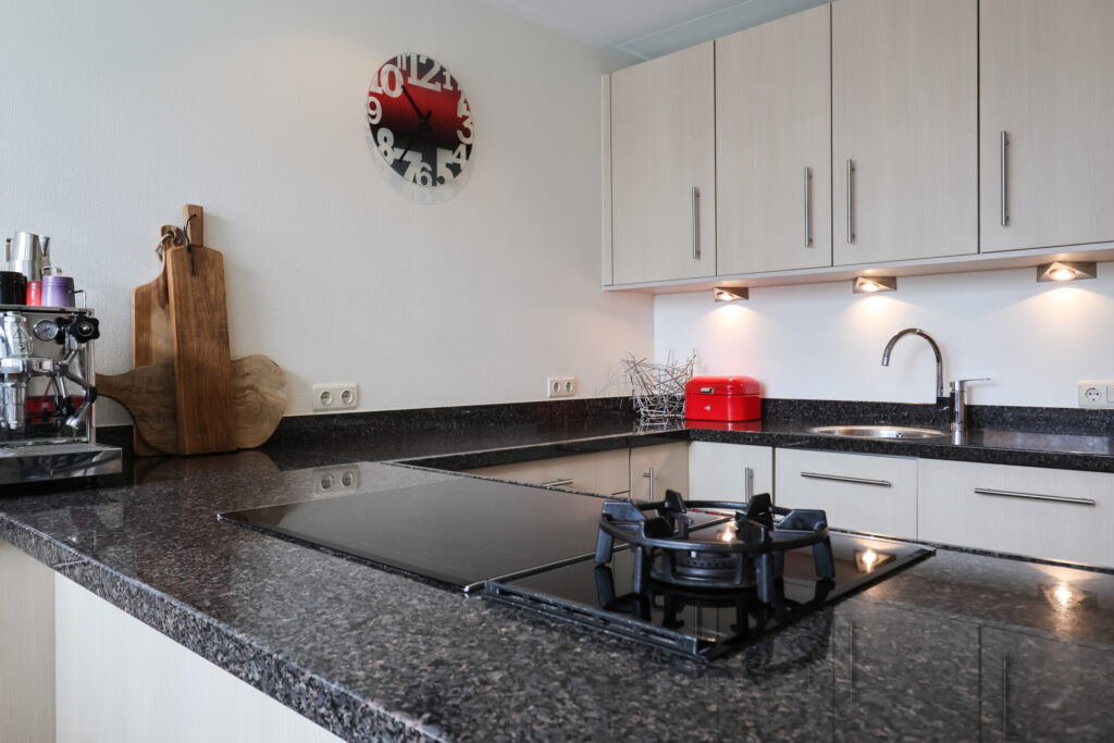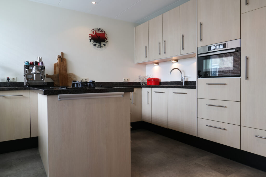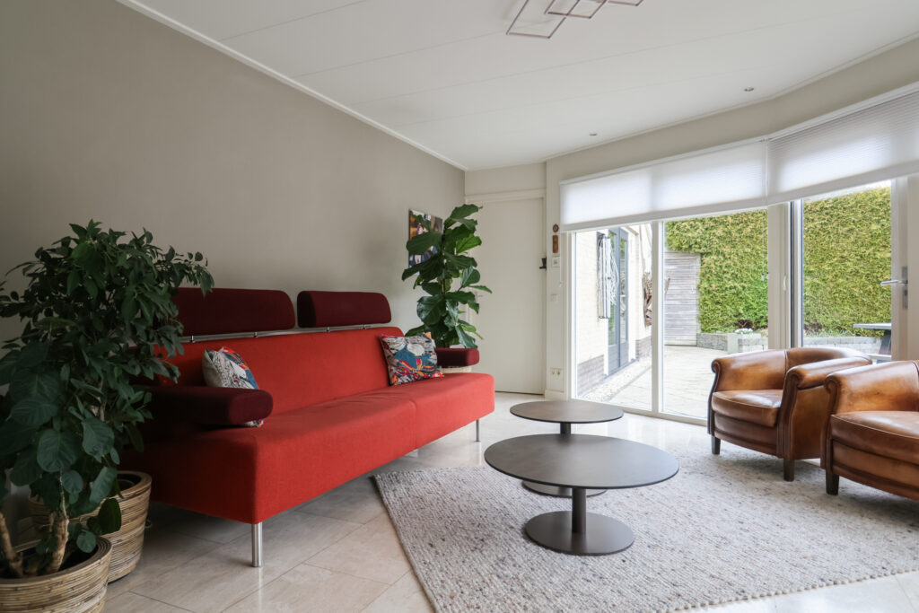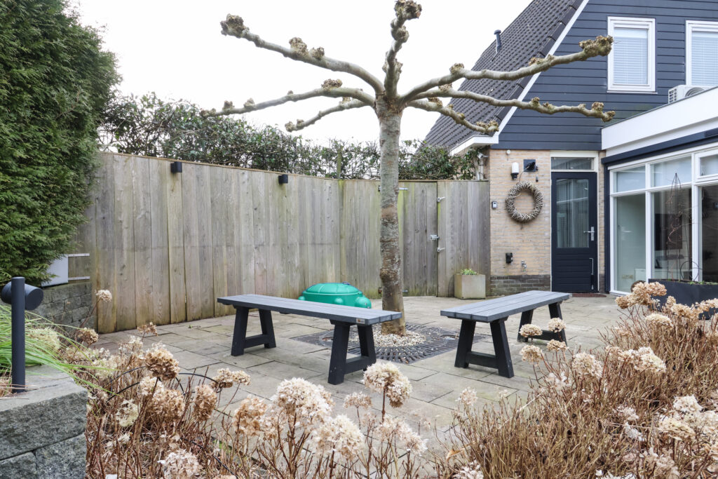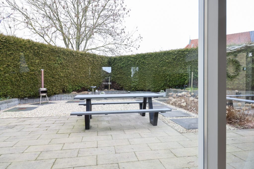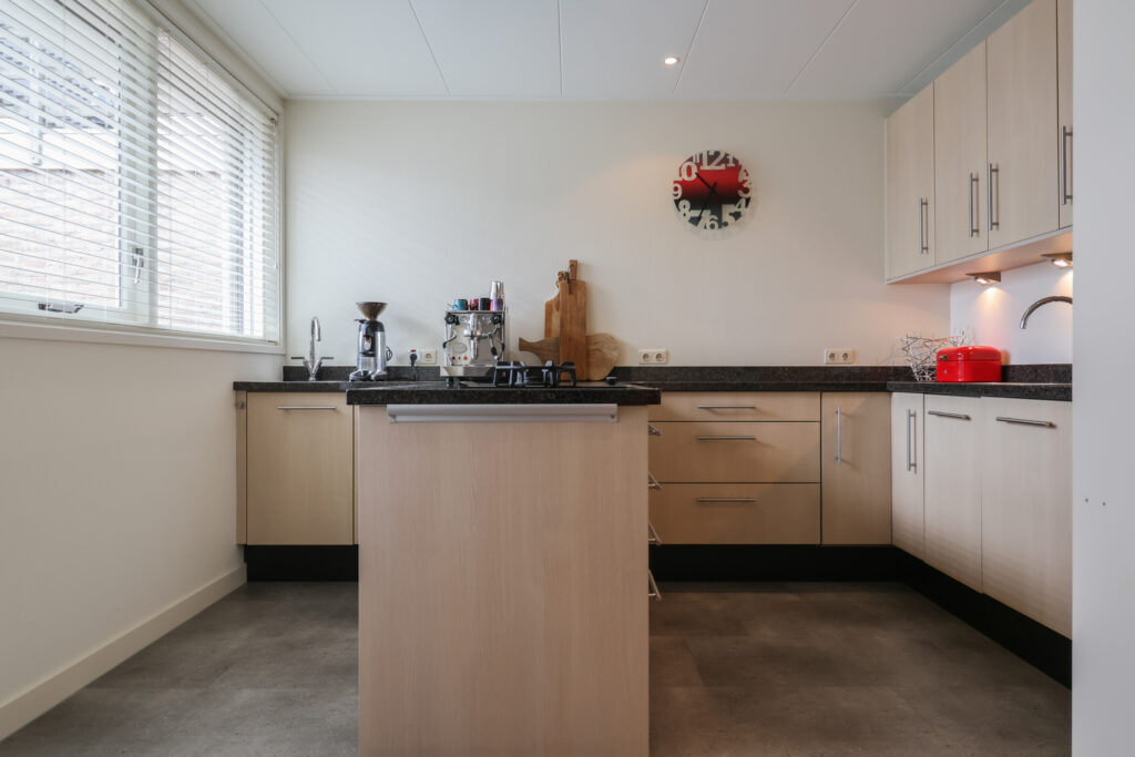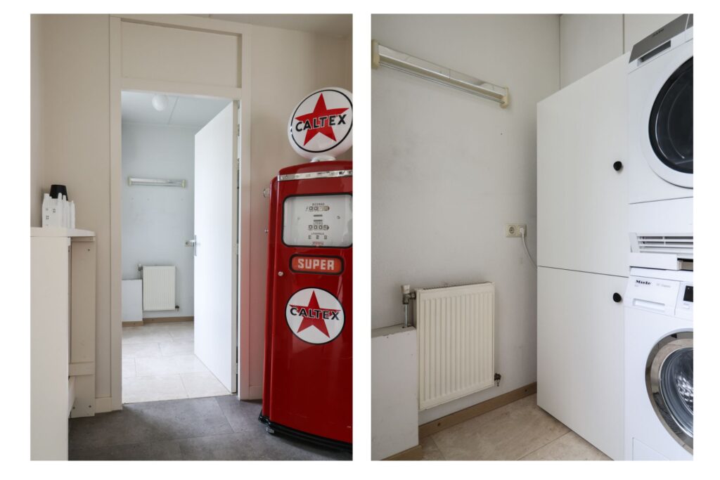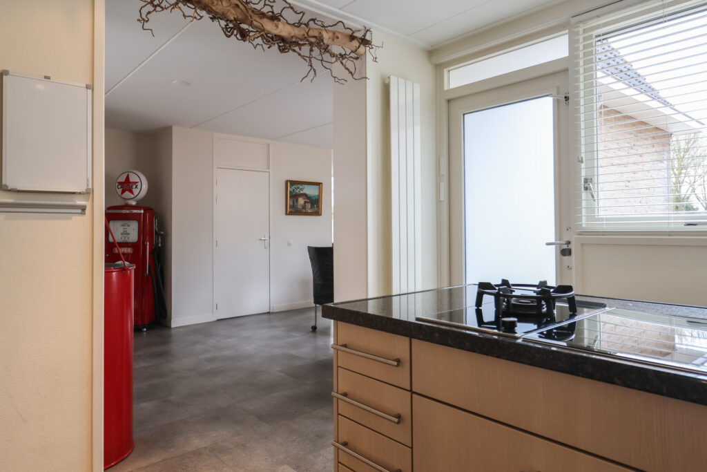 Vanuit de woonkamer is ook de bijkeuken bereikbaar, waar zich onder andere de wasmachineopstelling en de c.v.-installatie bevinden. Vanuit de bijkeuken is er een deur naar de achtertuin.