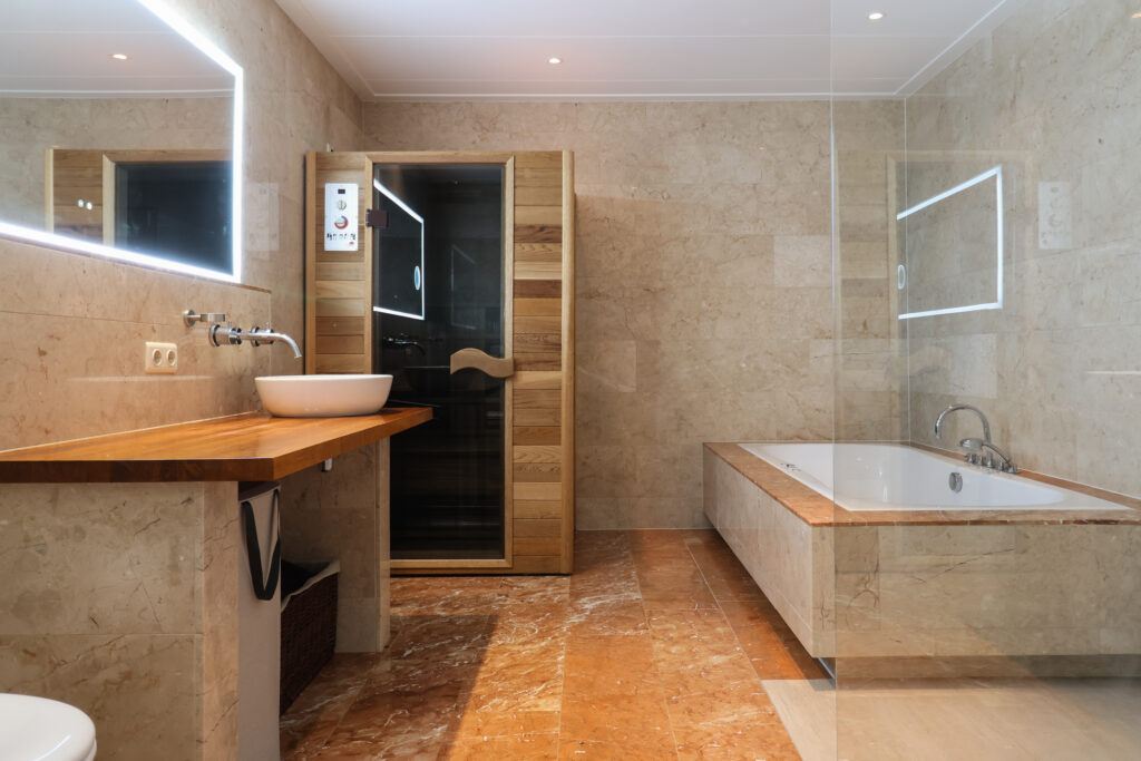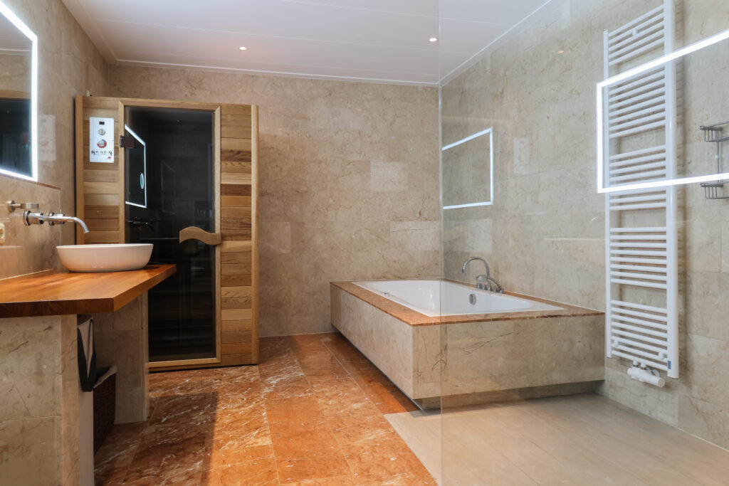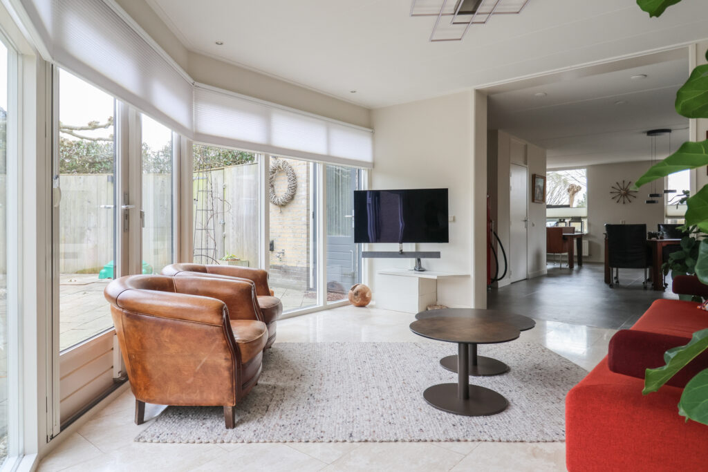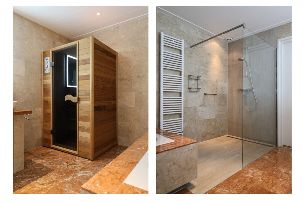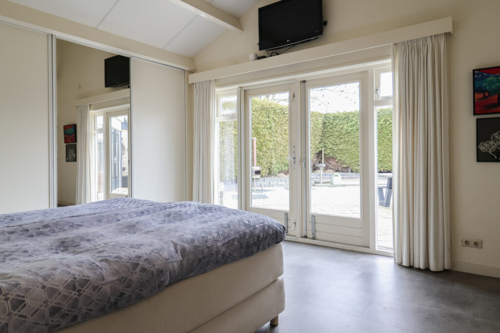 Aan de achterzijde loopt de woonkamer over in een prettig extra uitgebouwd woongedeelte met een fraaie glazen wand en uitzicht over de achtertuin. Vanuit deze ruimte is de royale slaapkamer bereikbaar, voorzien van een kastenwand en openslaande deuren naar de tuin. En suite bevindt zich een luxe, ruim opgezette badkamer met inloopdouche, tweede toilet, wastafelmeubel, whirlpool ligbad en sauna.