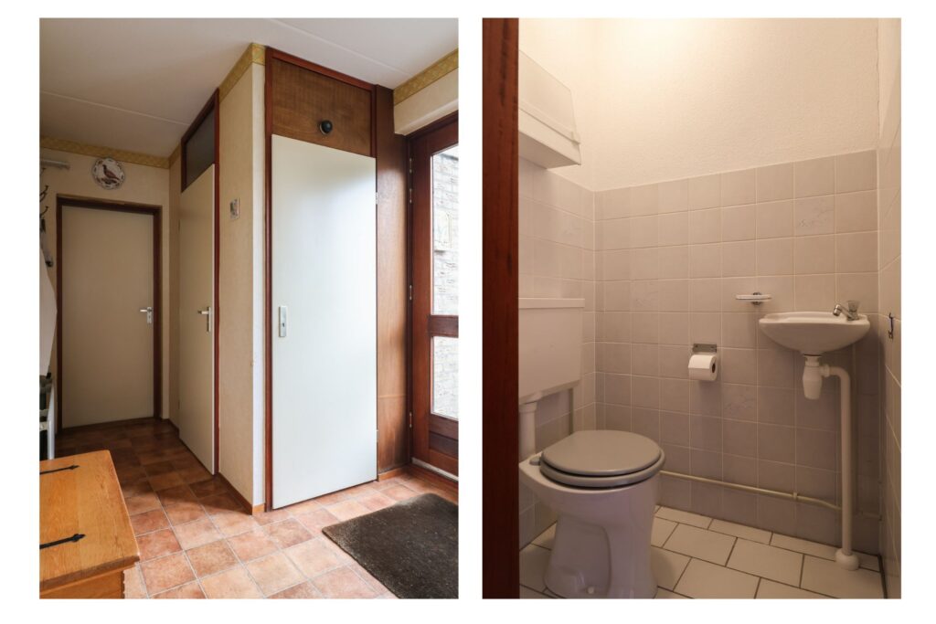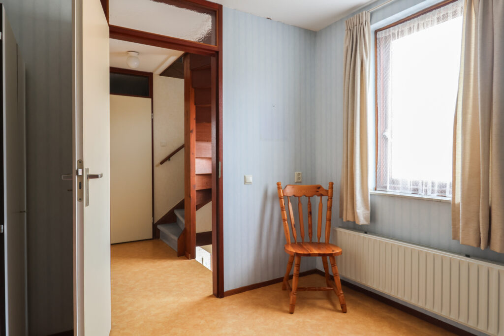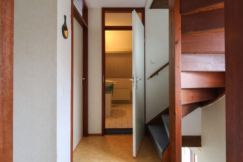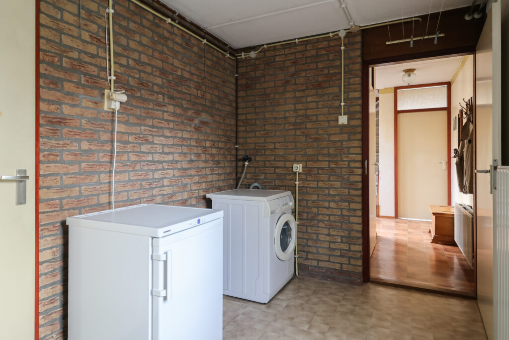 Begane grond: entree/hal met meterkast, toilet met fonteintje en trapopgang. Lichte woonkamer met open keuken in hoekopstelling en eethoek. Vanuit de keuken heb je vrij zicht op de achtertuin. Via de hal bereik je de bijkeuken met CV-opstelling, wasmachineaansluiting, toegang tot de aangebouwde garage en deur naar de tuin.
