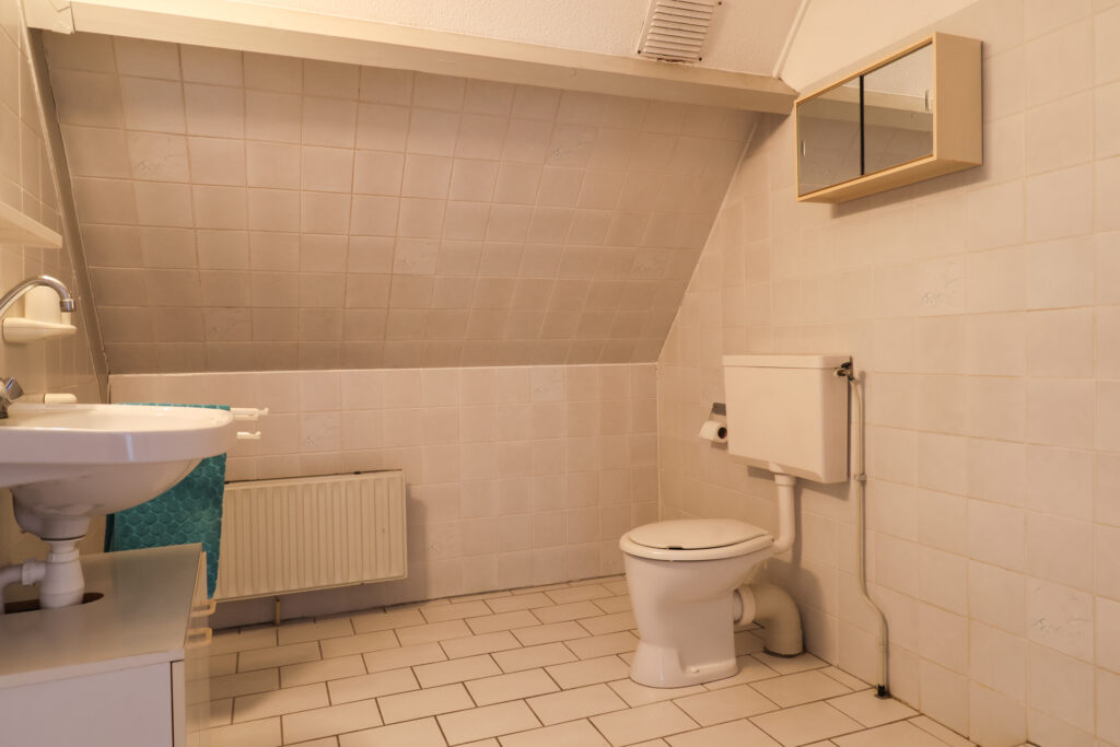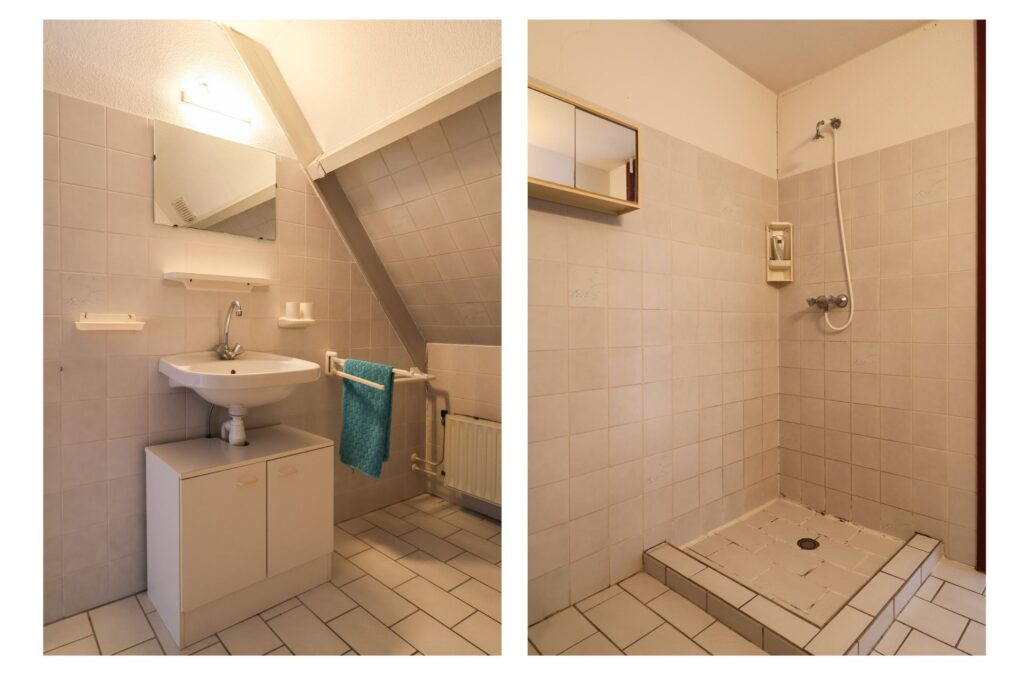 Eerste verdieping: drie slaapkamers en een badkamer met wastafel, douche en toilet.