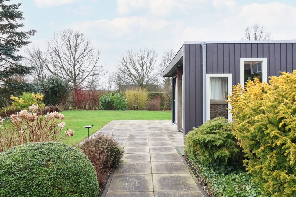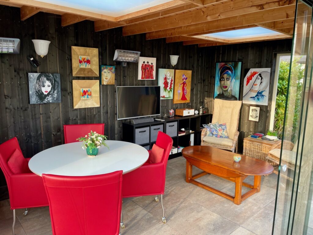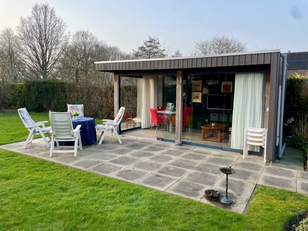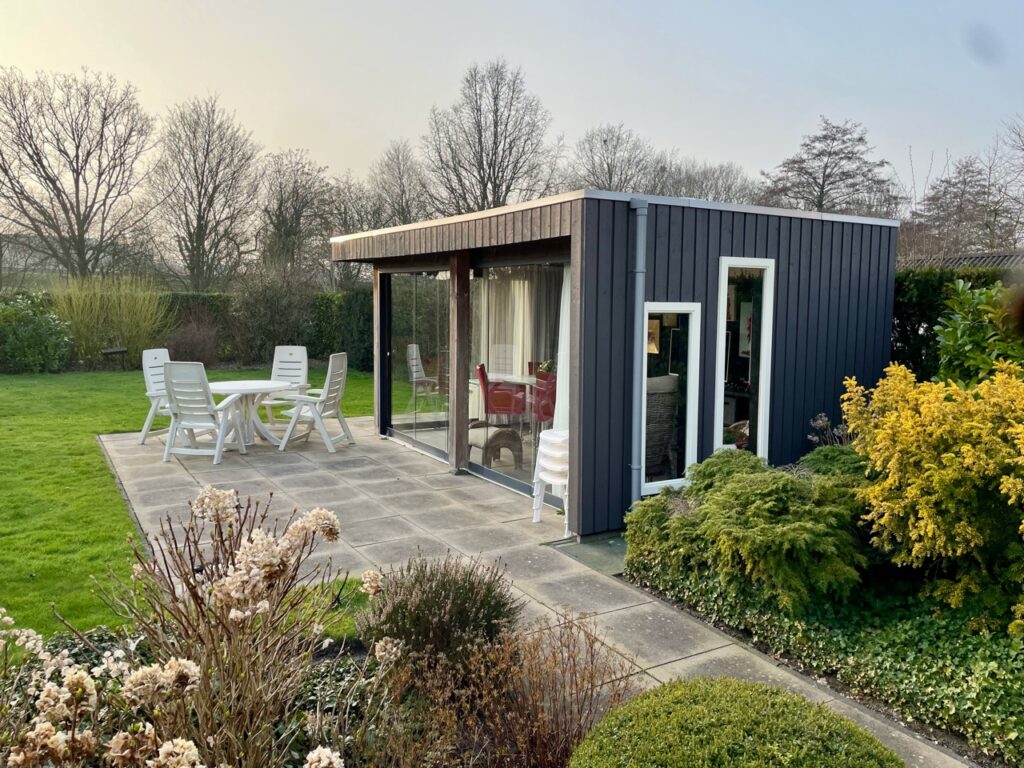 Ruime achtertuin op het westen met fijn tuinhuis voorzien van alle gemakken.