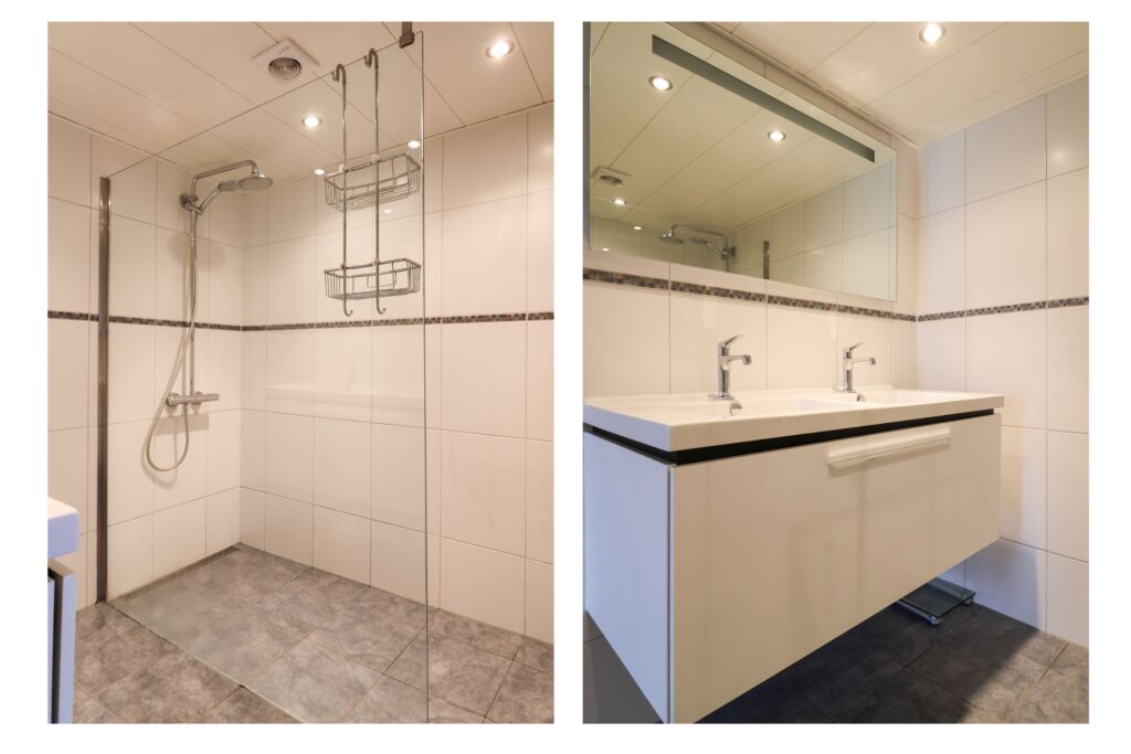 Begane grond: Via ruime oprit, geschikt voor meerdere auto’s, via overkapping de entree/hal, sfeervolle leef-keuken met zithoek en prachtig zicht aan de voorzijde, U-vormige eigentijdse keuken met diverse inbouwapparatuur met in het verlengde een sfeervolle woonkamer met houtkachel, via de keuken is toegang tot een tussenhal met trap naar 1e verdieping en hobby-werkkamer, aansluitend de bijkeuken met wasmachine opstelling, toilet met fonteintje, deur naar de achtertuin en keurige badkamer v.v. dubbele wastafel en inloop douche. Via de entree/hal is tevens de aangebouwde ruime garage (ruime 35 m2) met vliering te bereiken.