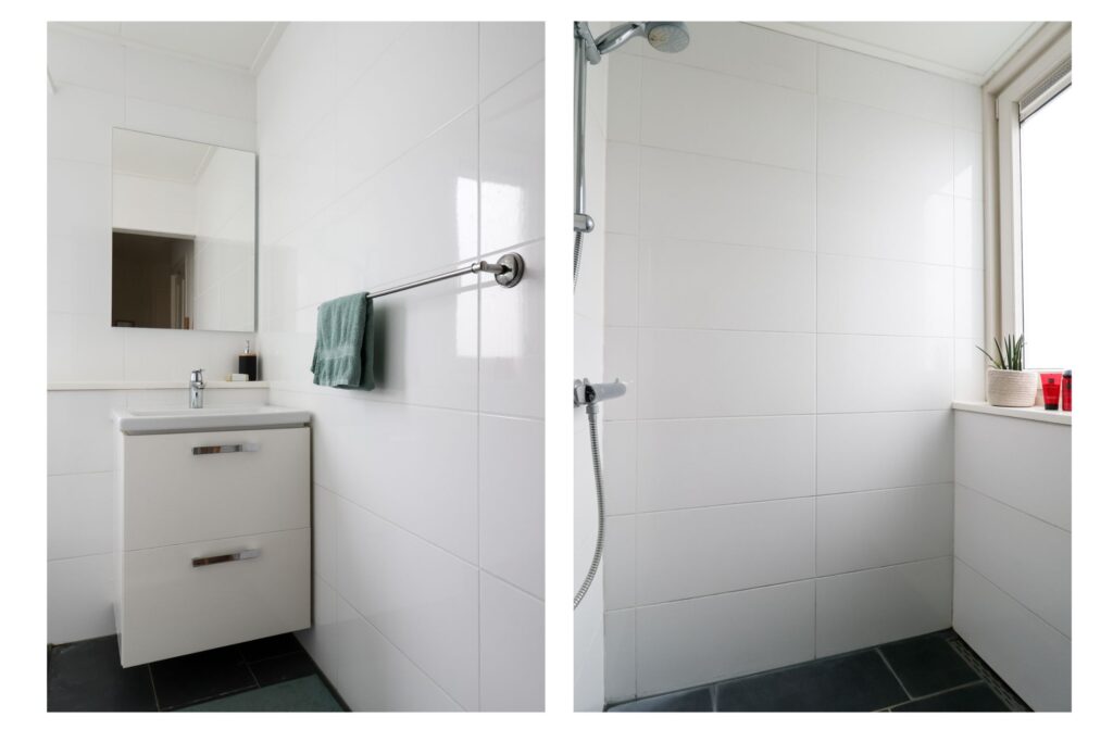 1e verdieping: ruime overloop met vaste kast, badkamer met douche en wastafel en 3 keurig ingerichte slaapkamers.