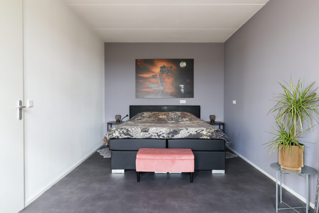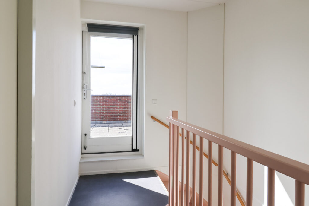 Tweede verdieping: Overloop met doorloop naar technische ruimte/berging, grote slaapkamer en dakterras.